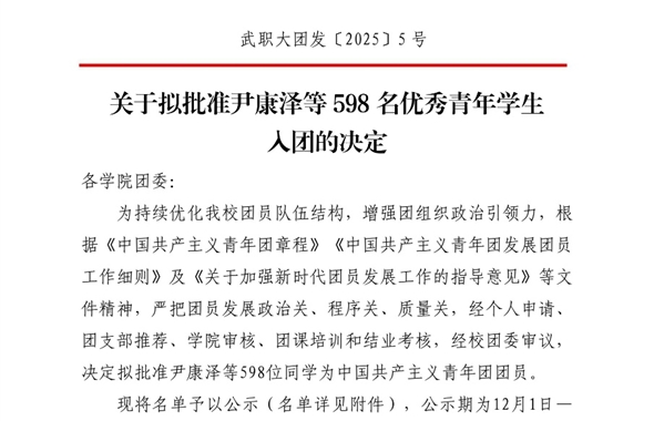 關于擬批準尹康澤等598名優(yōu)秀青年學生入團的決定