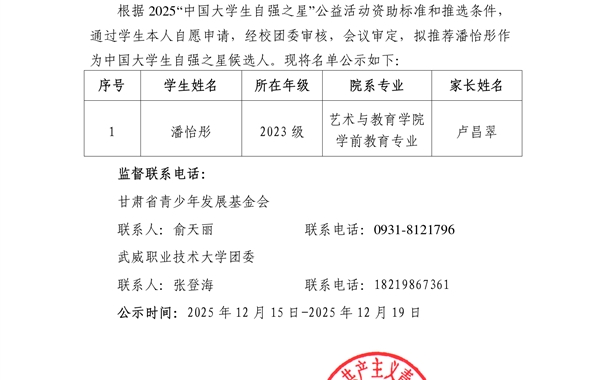 擬推薦潘怡彤為“中國大學生自強之星”候選人的公示