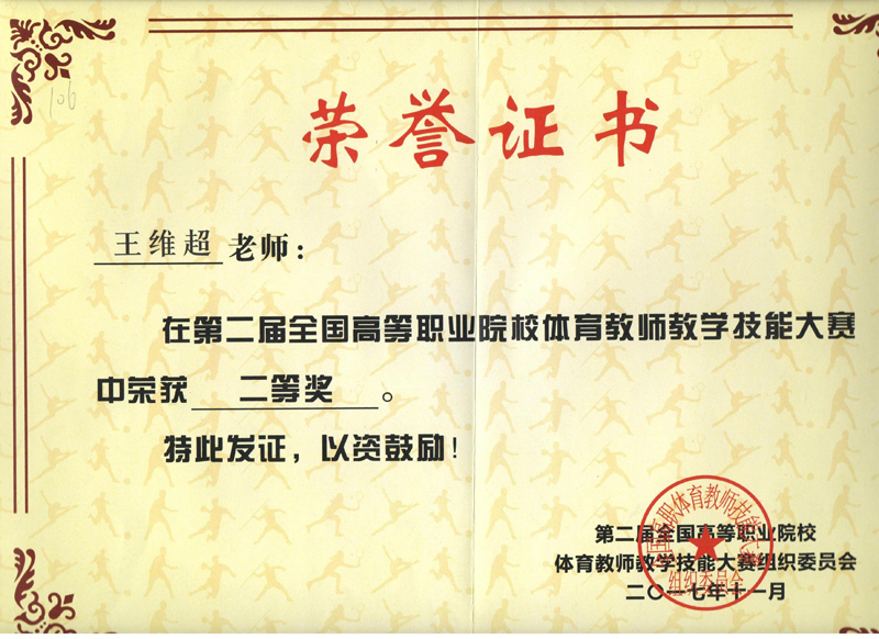 2017年11月27日至30日,人文藝術(shù)教育系王維超老師,代表我省參加了由教育部高等學(xué)校體育指導(dǎo)委員會(huì)在蘇州職業(yè)大學(xué)舉辦的,第二屆全國(guó)高等職業(yè)院校體育教師技能大賽,經(jīng)過(guò)激烈角逐最終榮獲二等獎(jiǎng)。