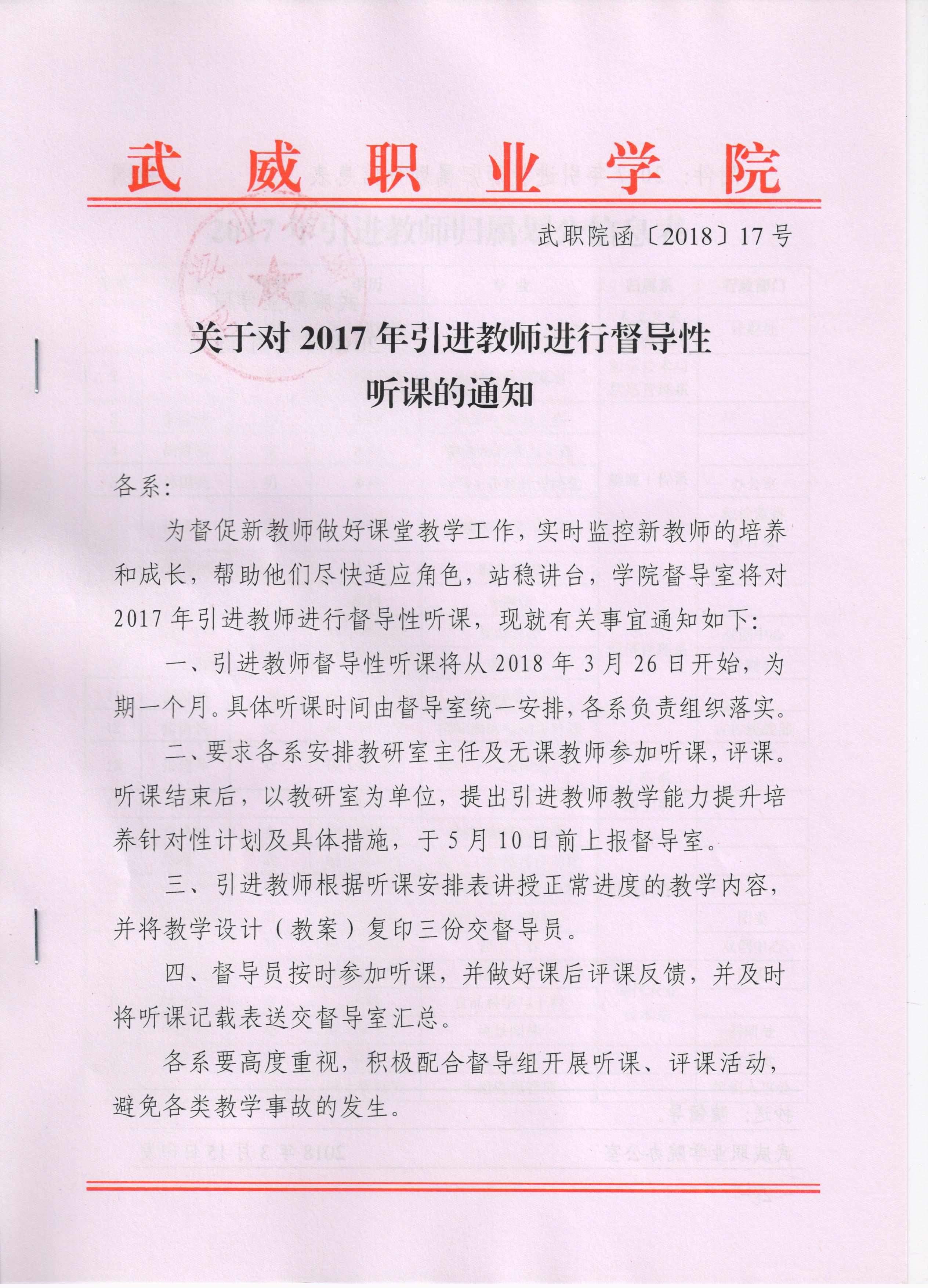 關(guān)于對2017年引進教師進行督導(dǎo)性聽課的通知