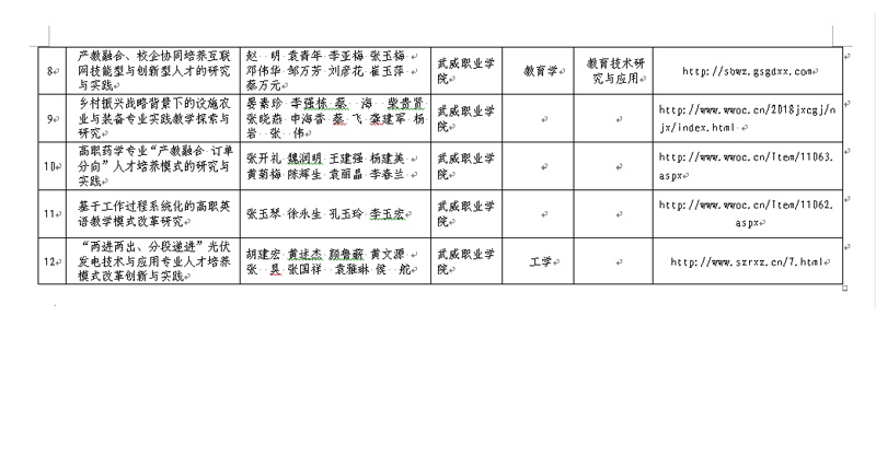 根據(jù)甘肅省人力資源和社會保障廳、甘肅省教育廳《關于開展2018年甘肅省職業(yè)教育教學成果獎評選表彰工作的通知》精神,經(jīng)個人申報,學院審核,決定擬推薦以下所提交紙質材料、電子材料、申報網(wǎng)站等符合申報要求的12項教學成果參評2018年甘肅省職業(yè)教育教學成果獎,現(xiàn)予以公示。
