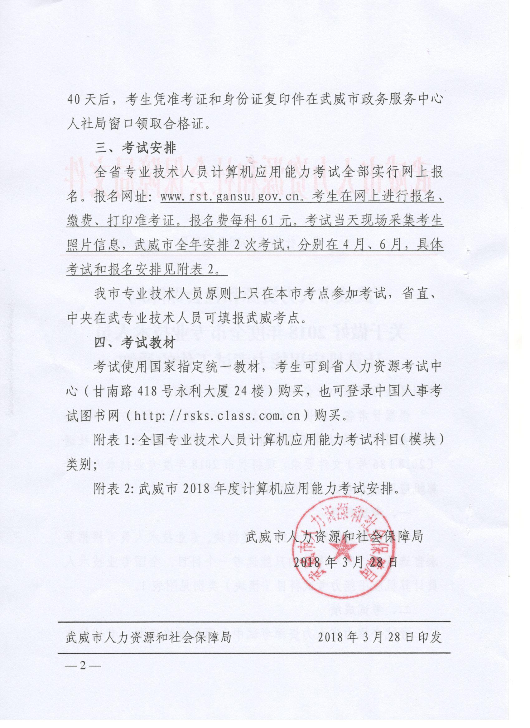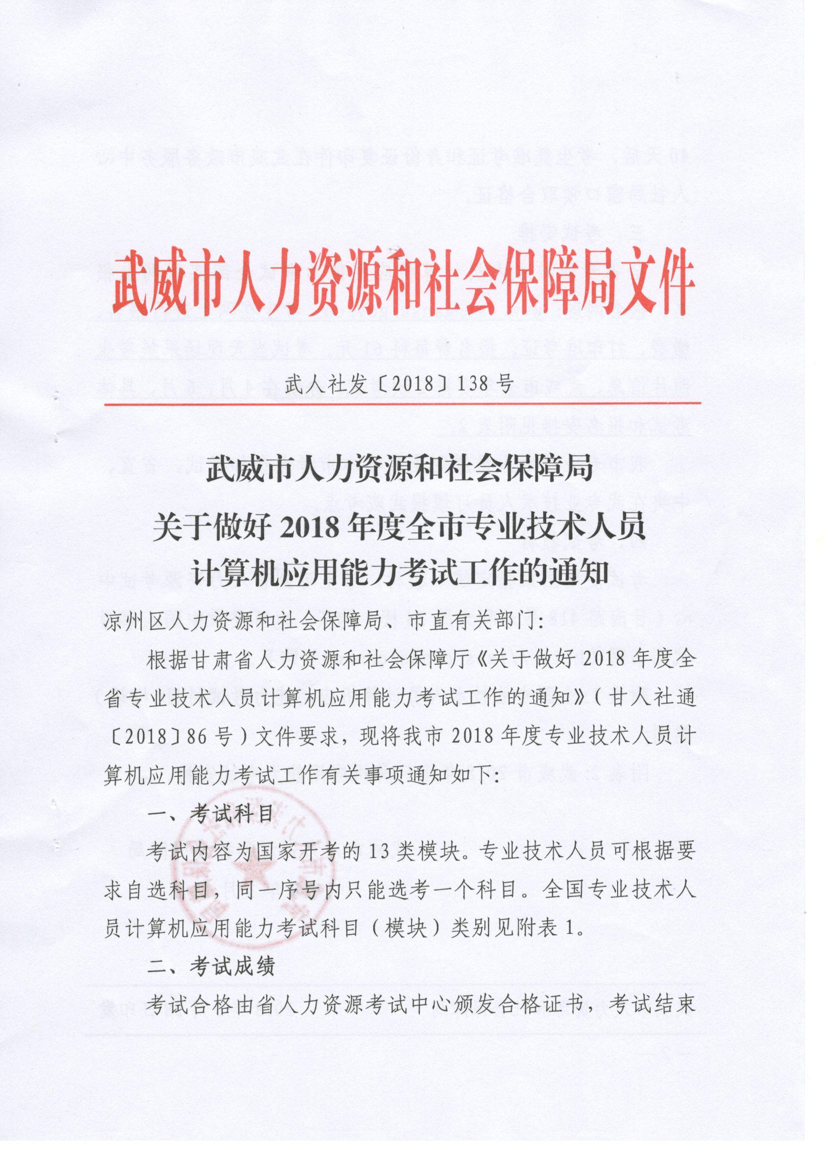 <轉(zhuǎn)>武威市人力資源和社會保障局關(guān)于做好2018年度全市專業(yè)技術(shù)人員計算機應用能力考試工作的通知(武人社發(fā)〔2018〕138號 )