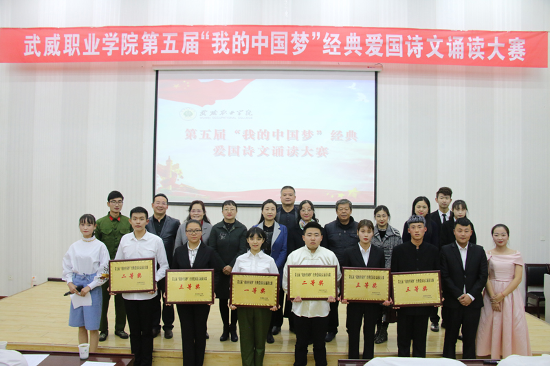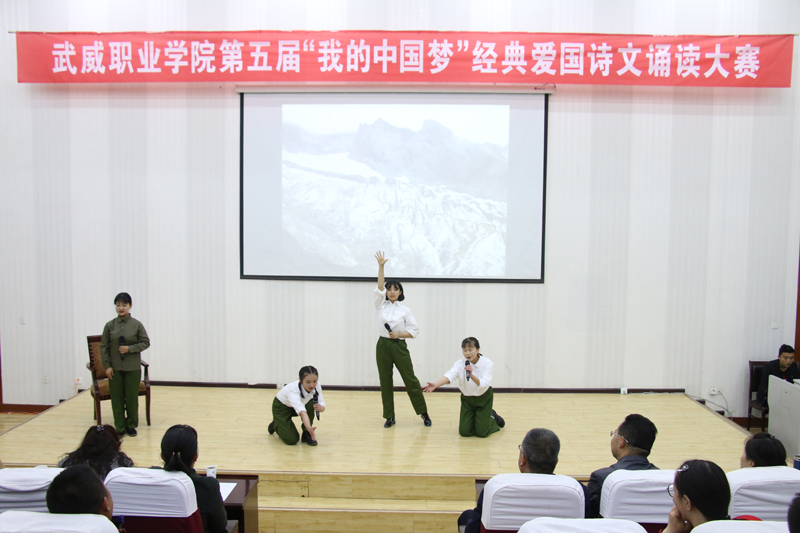 全場比賽以“我的中國夢”為切入點,誦詩抒情、借詞言志,傳承中華民族經(jīng)典愛國詩詞和優(yōu)秀傳統(tǒng)文化,培育與踐行社會主義核心價值觀。各參賽作品融入了歌曲、場景表演等多種藝術(shù)形式,進一步激發(fā)了同學(xué)們的愛國熱情和報國之志。經(jīng)過激烈角逐,醫(yī)學(xué)技術(shù)與信息管理系選送的作品《永遠的格桑梅朵》榮獲一等獎;人文藝術(shù)教育系選送的作品《我的墓碑》、護理系選送的作品《人民萬歲》榮獲二等獎;現(xiàn)代農(nóng)業(yè)技術(shù)系選送的作品《我的爸爸》、汽車工程系選送的作品《海棠花祭》、建筑工程系選送的作品《中國軍魂》榮獲三等獎。