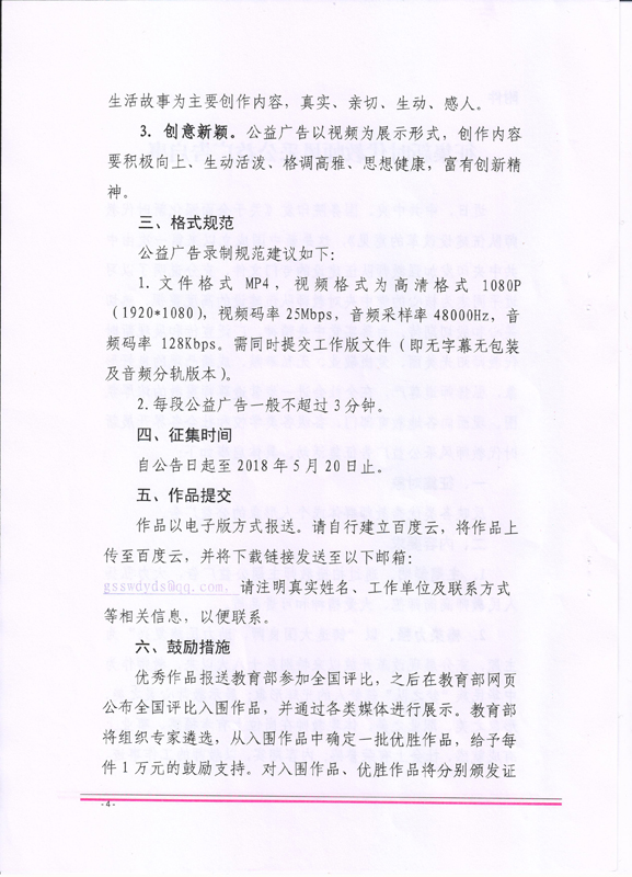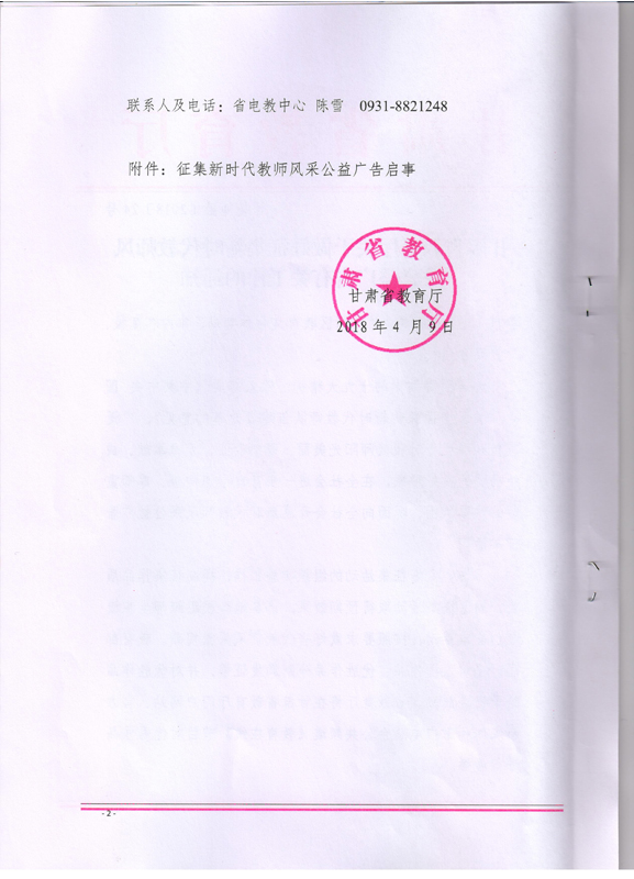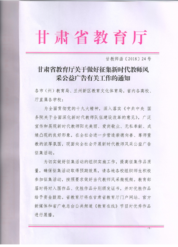 ???? 現(xiàn)將甘肅省教育廳《甘肅省教育廳關于做好征集新時代教師風采公益廣告有關工作的通知》(甘教師函〔2018〕24號)轉(zhuǎn)發(fā)你們,請各部門、單位根據(jù)通知要求認真組織,積極參與。將參賽作品于5月15日前報宣傳統(tǒng)戰(zhàn)部辦公室,宣傳統(tǒng)戰(zhàn)部對報送作品匯總后統(tǒng)一報送省教育廳電教中心。