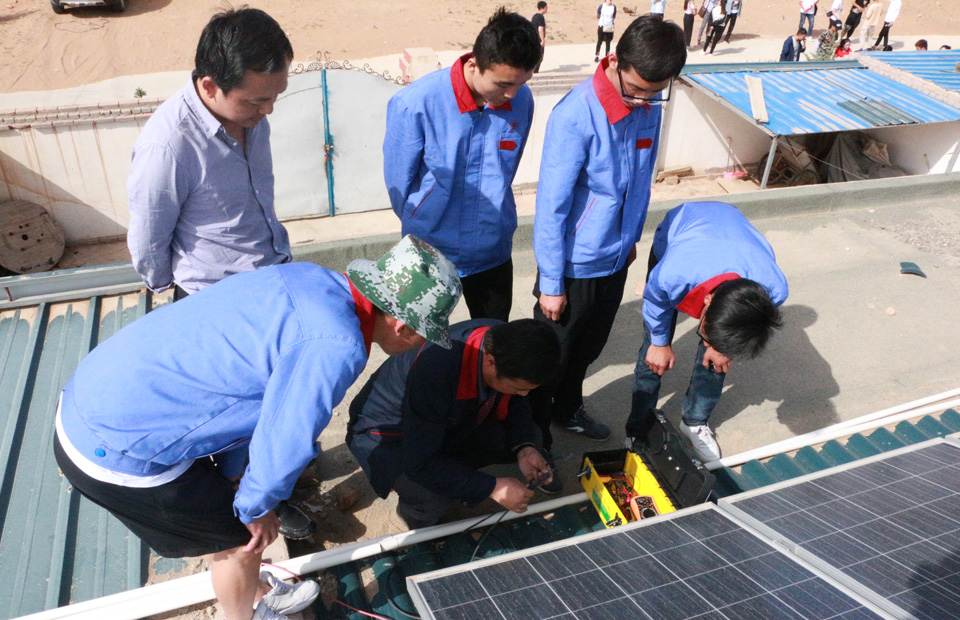 ? ? ?走進圓夢新村,由學院校辦企業(yè)武威泰豐新能源有限公司建設(shè)的200戶貧困家庭戶均3kw的分布式光伏發(fā)電系統(tǒng)映入眼簾。在社區(qū)書記郭林春的帶領(lǐng)下,黨員教師和學生入黨積極分子上門幫助用戶檢查維修光伏發(fā)電設(shè)備,檢查光伏組件的老化跡象以及所有連接器是否連接緊密、有無腐蝕現(xiàn)象,檢查組件是否接地良好。了解農(nóng)戶的需求,為農(nóng)戶講解光伏設(shè)備后期維護、電費結(jié)算方式以及國家扶貧惠民的政策等知識,并對部分農(nóng)戶屋頂光伏組件故障進行了排除,對光伏組件進行了大面積清潔維護。