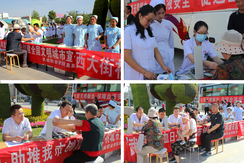 為保障臨床用血安全,給我市創(chuàng)建全國文明城市活動增亮添彩,由武威市衛(wèi)生計(jì)生委、武威市紅十字會主辦,武威市中心血站承辦的“世界無償獻(xiàn)血者日”大型宣傳、義診、獻(xiàn)血活動于6月14日在武威市文化廣場隆重舉行。學(xué)院附屬醫(yī)院醫(yī)護(hù)人員、學(xué)院紅十字志愿者方隊(duì)、無償獻(xiàn)血獲獎(jiǎng)?wù)叻疥?duì)等30余家單位的干部群眾參加了活動。
