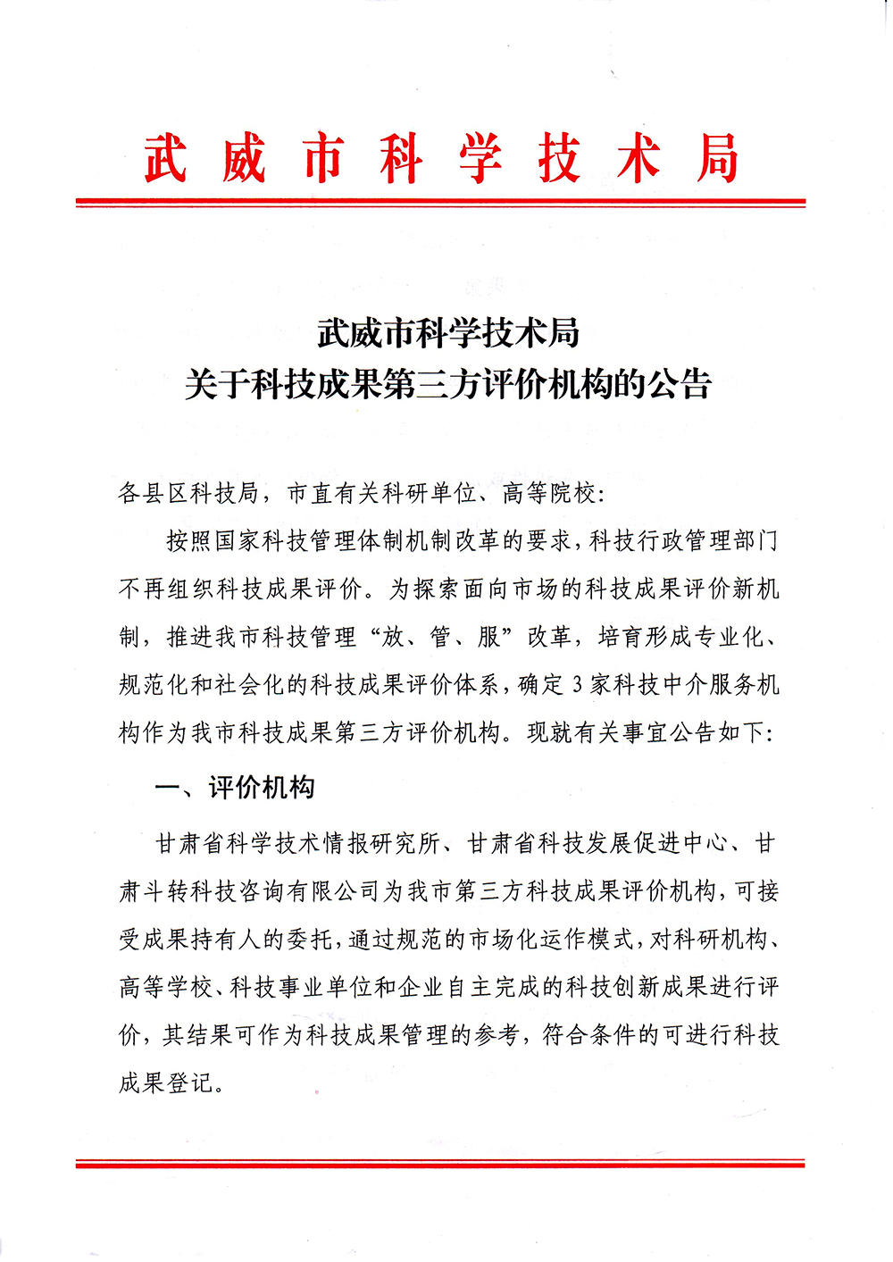 轉(zhuǎn)發(fā)武威市科學(xué)技術(shù)局關(guān)于科技成果第三方評(píng)價(jià)機(jī)構(gòu)的公告