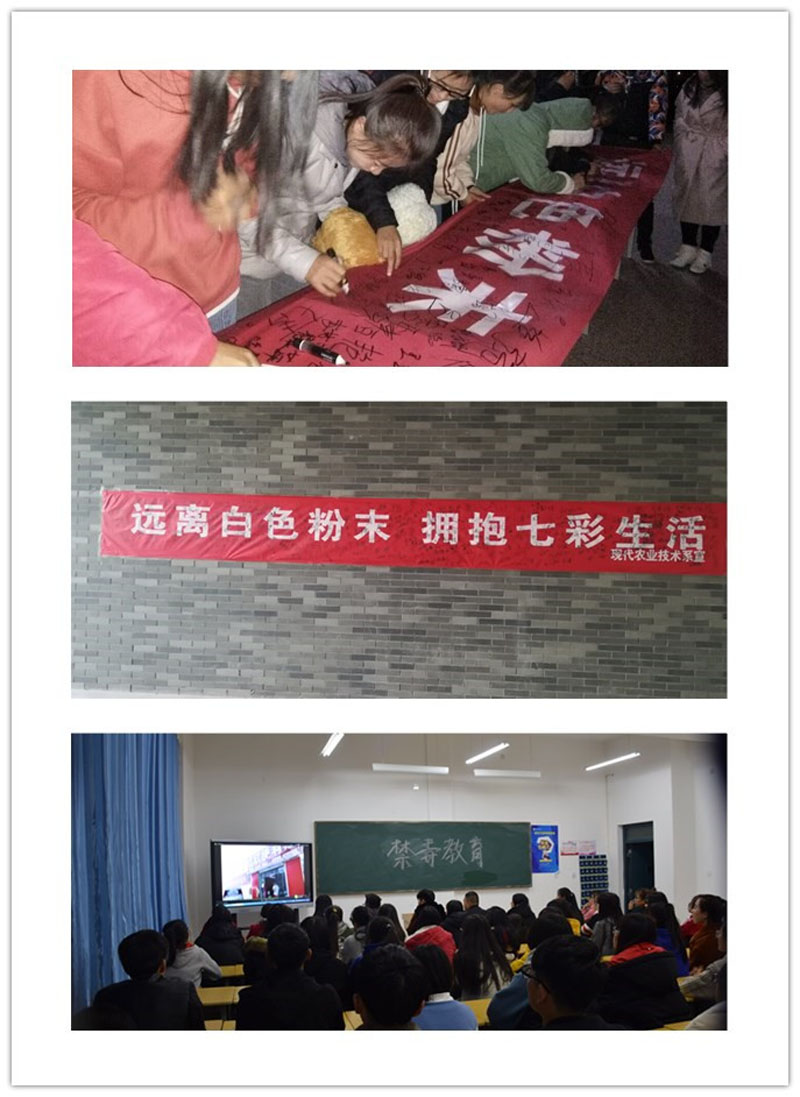 現(xiàn)代農(nóng)業(yè)技術(shù)系結(jié)合自身實際和條件,重點開展了以下活動。一是通過在行樹樓張貼“遠離白色粉末擁抱七彩生活”禁毒橫幅,號召全系師生創(chuàng)建和諧、文明、無毒的校園環(huán)境;二是各班開展了禁毒宣傳主題班會,宣傳毒品危害,普及防毒知識,警示大家珍愛生命,遠離毒品;三是組織學(xué)生參加學(xué)院禁毒征文大賽,用語言表達禁毒的決心;四是團學(xué)會組織各班同學(xué)網(wǎng)上參觀“中國禁毒數(shù)字展覽館”,觀看禁毒題材的優(yōu)秀微電影《一路有你》、《少年的秘密》、《蛻變》、《愛心帶你回家》,讓在場同學(xué)深刻感受到毒品的危害,堅定了同學(xué)們禁毒防毒的信心。