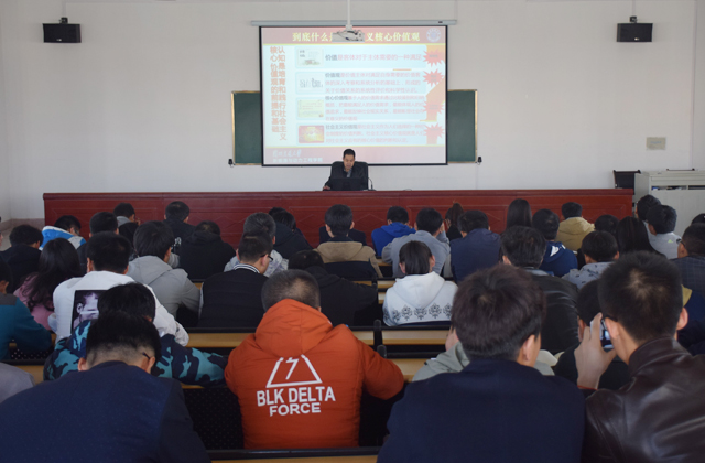 翟存祥從社會主義核心價值觀的時代背景、社會主義核心價值觀的頂層設(shè)計、核心價值觀與核心價值體系的關(guān)系、社會主義核心價值觀的系統(tǒng)培育、社會主義核心價值觀的全面踐行等五個方面,分析了中國共產(chǎn)黨價值取向的發(fā)展歷程、培育和踐行社會主義核心價值觀的重要性和迫切性,培育和踐行社會主義核心價值觀對實現(xiàn)中國夢的重要現(xiàn)實意義和深遠歷史意義,以及培育和踐行社會主義核心價值觀的措施等問題,并對為什么要培育和踐行、怎么培育和踐行作了系統(tǒng)和精彩的解讀。翟存祥指出,十八大報告將社會主義核心價值觀凝練為24個字:“富強、民主、文明、和諧;自由、平等、公正、法治;愛國、敬業(yè)、誠信、友善”,從國家、社會、個人三個層面,簡單扼要、簡約樸實、簡潔通俗地提出了社會主義核心價值觀的新表達,也為當(dāng)今中國社會的核心價值觀構(gòu)建提出了新要求。社會主義核心價值觀既有理論的延續(xù)性,又有現(xiàn)實的針對性;既有目標追求,又有價值導(dǎo)向,還有行為準則,是人心所愿、眾望所歸。翟存祥結(jié)合學(xué)院發(fā)展實際,要求學(xué)生黨員及班團干部從現(xiàn)在做起,從自己做起,努力向上,踐行社會主義核心價值觀,追求有信念,有夢想,有奮斗,有奉獻的人生,讓自己的人生更有意義。