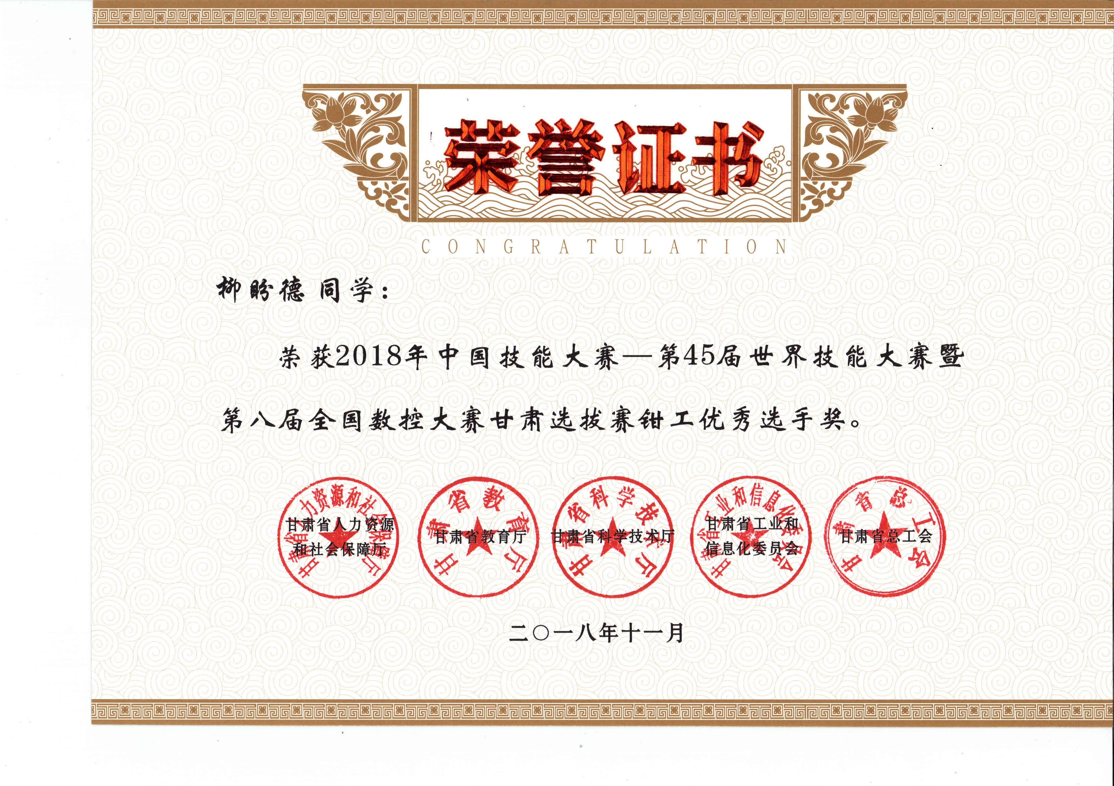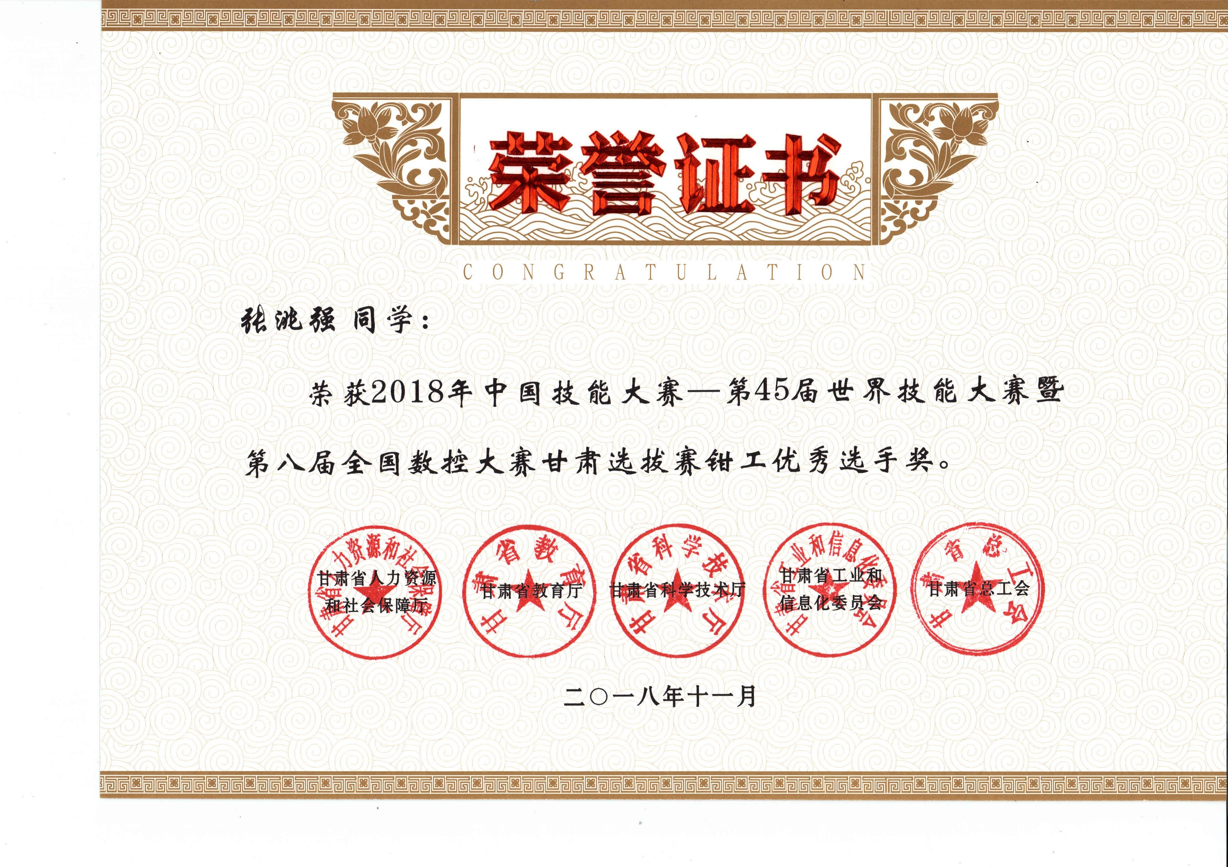 2018年中國(guó)技能大賽--第45屆世界技能大賽暨第八屆全國(guó)數(shù)控大賽甘肅選拔賽(鉗工項(xiàng)目)獲獎(jiǎng)證書