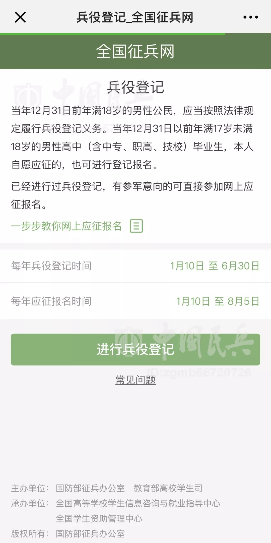 中國民兵北京1月9日電?張東華、記者劉國順報道:日前,國防部征兵辦公室下發(fā)《關(guān)于做好2019年征兵準備工作的通知》,對新年度征兵準備工作進行安排部署,要求各地深入貫徹習(xí)近平強軍思想,全面聚焦備戰(zhàn)打仗,統(tǒng)籌推進征兵組織建設(shè)、能力建設(shè)、法規(guī)建設(shè)、廉政建設(shè),確保高質(zhì)量完成新年度征兵任務(wù),并明確全國征兵網(wǎng)(網(wǎng)址:http://www.gfbzb.gov.cn),或關(guān)注“中國民兵”微信公眾號(ID:zgmb66720726)1月10日正式開通,受理網(wǎng)上兵役登記、應(yīng)征報名和政策咨詢等工作事項。