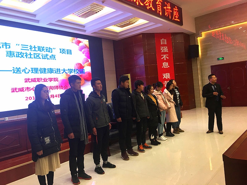 12月4日晚上,學(xué)生工作處聯(lián)合武威市“三社聯(lián)動(dòng)”惠政社區(qū)試點(diǎn)項(xiàng)目在學(xué)院菁英廳舉辦了心理健康專題講座暨心理信息員培訓(xùn)。此次講座邀請(qǐng)武威市心理咨詢師協(xié)會(huì)會(huì)長(zhǎng)何飛老師主講,學(xué)院各系輔導(dǎo)員、2017級(jí)、2018級(jí)班級(jí)心理信息員、心翼心理社團(tuán)會(huì)員等220多人聆聽了講座。學(xué)生工作處處長(zhǎng)王守云主持活動(dòng)。
