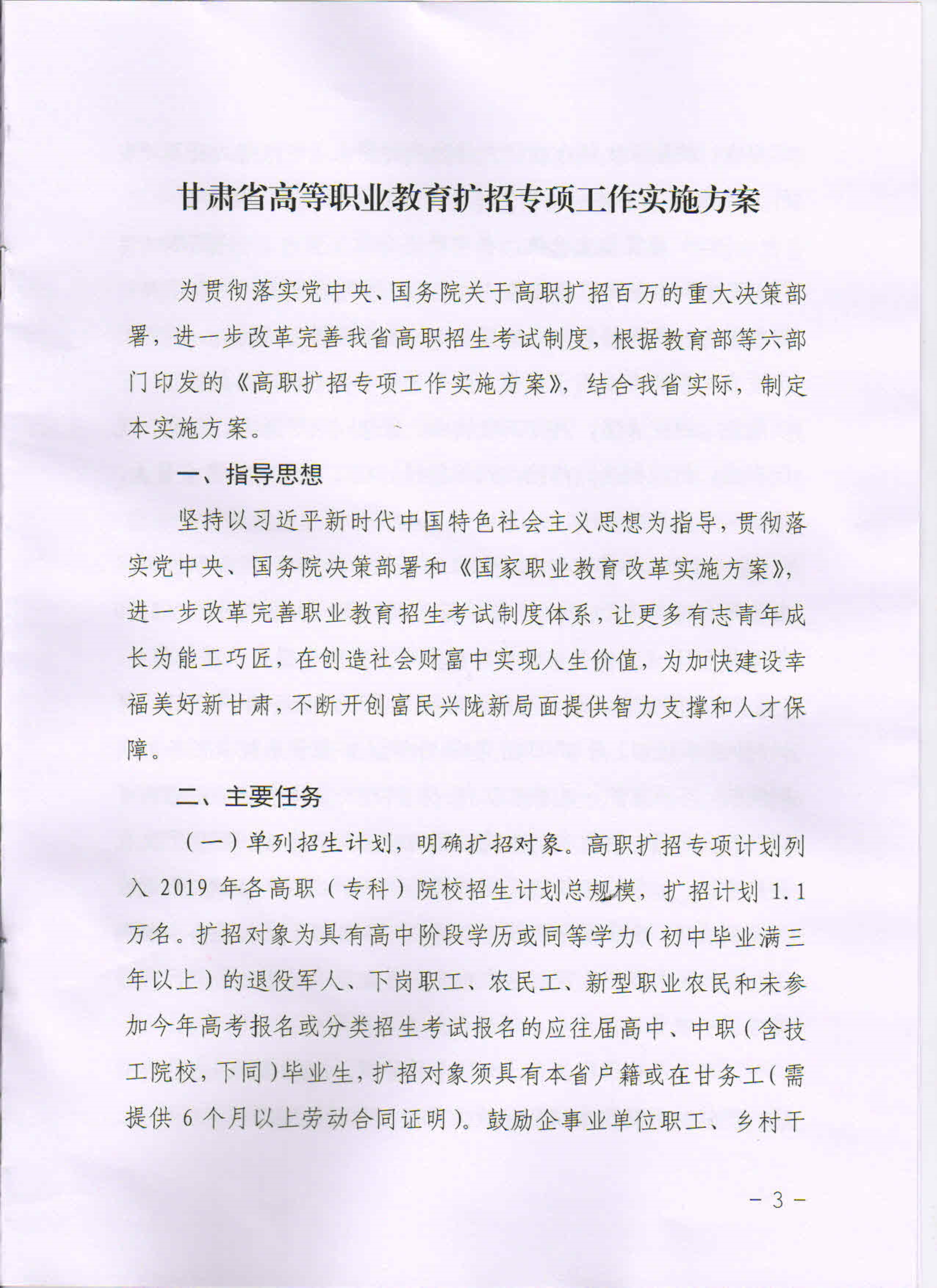 19年關(guān)于做好2019年甘肅省高等職業(yè)教育擴招專項考試招生工作的通知