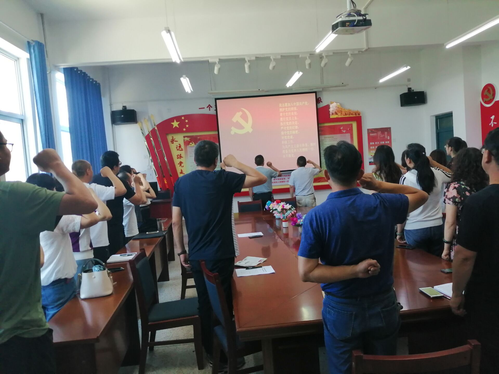 黨總支書(shū)記胡靜峰宣讀了中國(guó)共產(chǎn)黨預(yù)備黨員名單。在胡靜峰同志帶領(lǐng)下預(yù)備黨員面向黨旗進(jìn)行了入黨宣誓,其他黨員重溫了入黨誓詞。預(yù)備黨員劉心代表預(yù)備黨員進(jìn)行了表態(tài)發(fā)言。