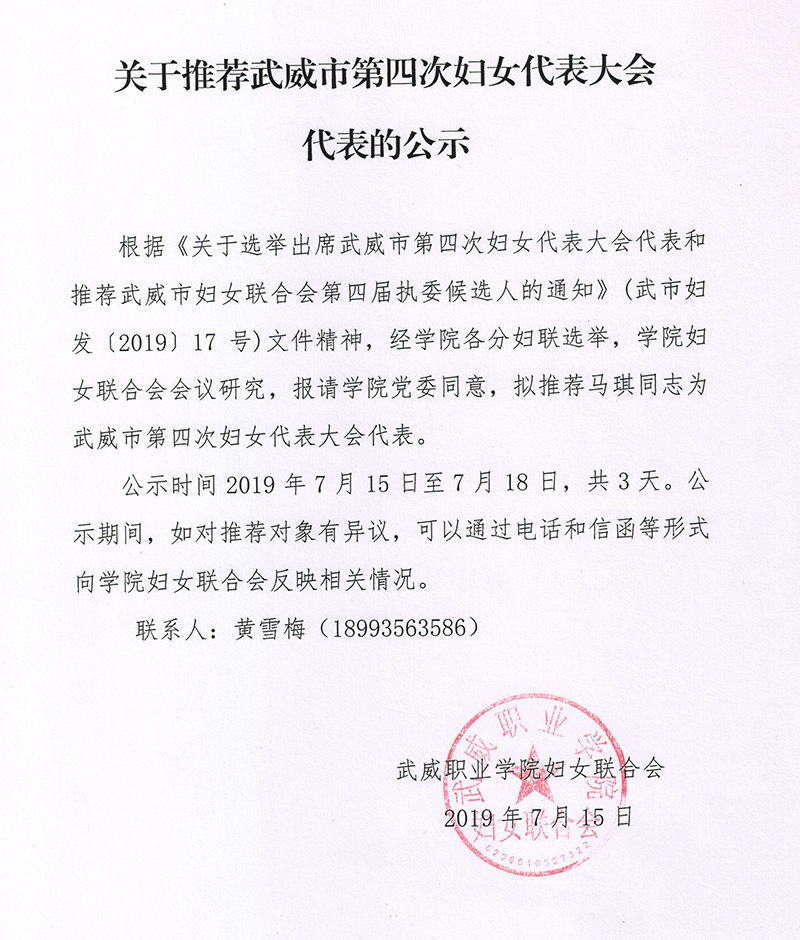關(guān)于推薦武威市第四次婦女代表大會(huì)代表的公示