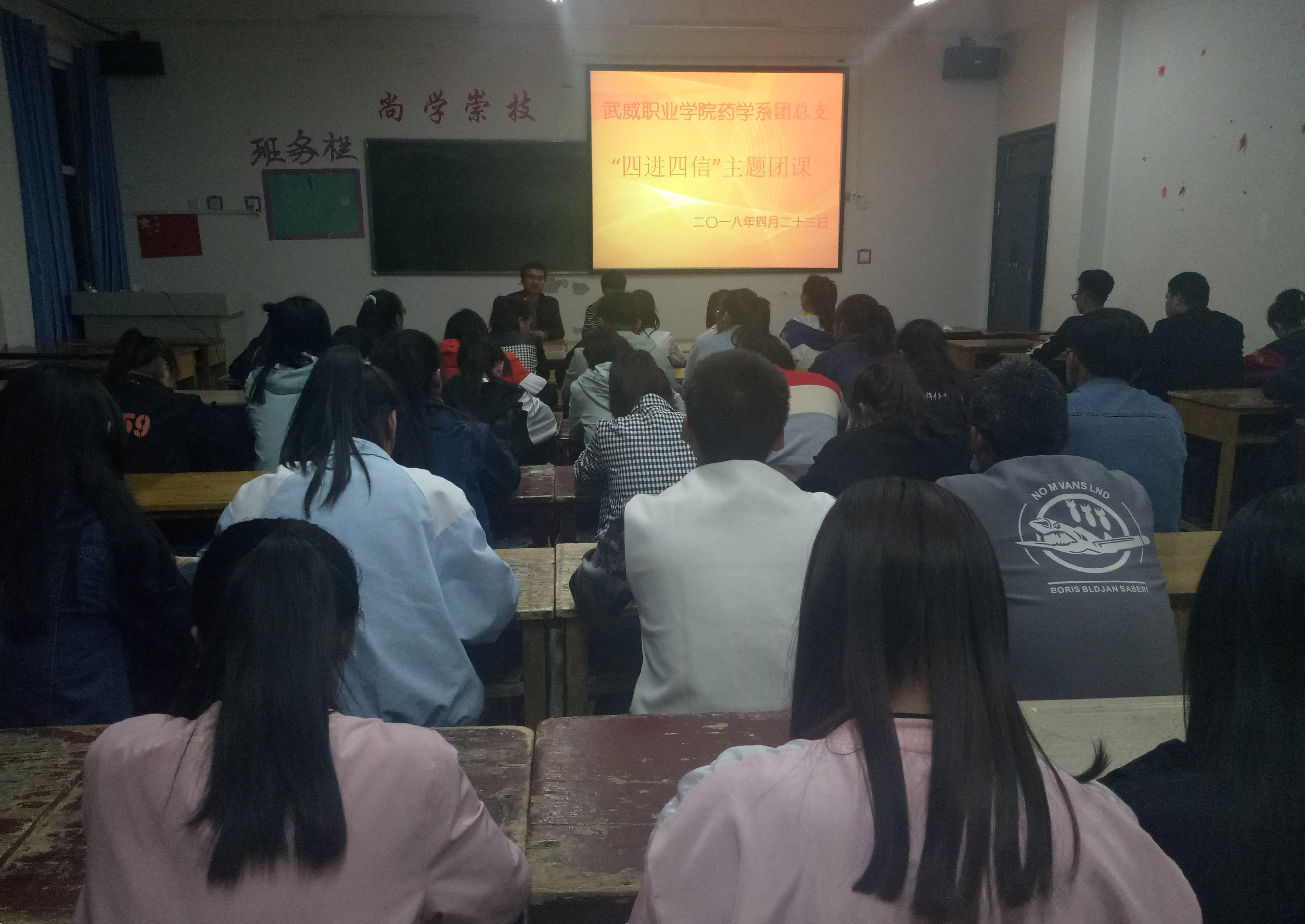 為深入學習宣傳貫徹習近平新時代中國特色社會主義思想,堅持以習近平新時代中國特色社會主義思想武裝團員干部和團員青年學生頭腦,積極推進各項工作開展。2018年4月23日晚,藥學系團總支組織16級團員青年及17級入團積極分子在明遠樓501教室開展關(guān)于“四進四信”的主題團課活動,團課由系團總支書記陳輝生主持。