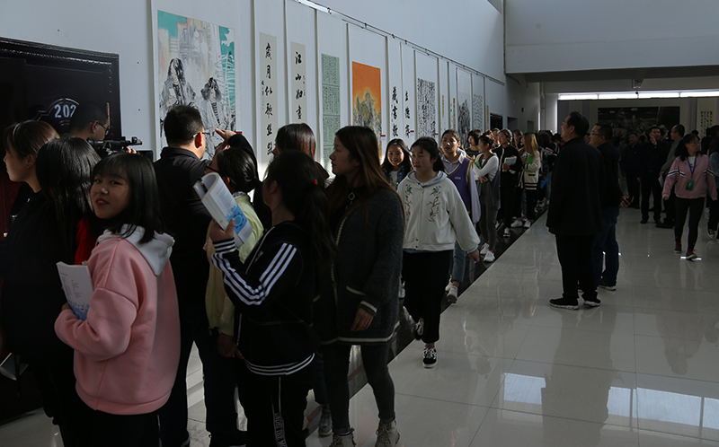 趙明宣布“不忘初心,牢記使命”武威美術(shù)書法作品交流展開幕。隨后,學院師生觀看欣賞了展覽作品。