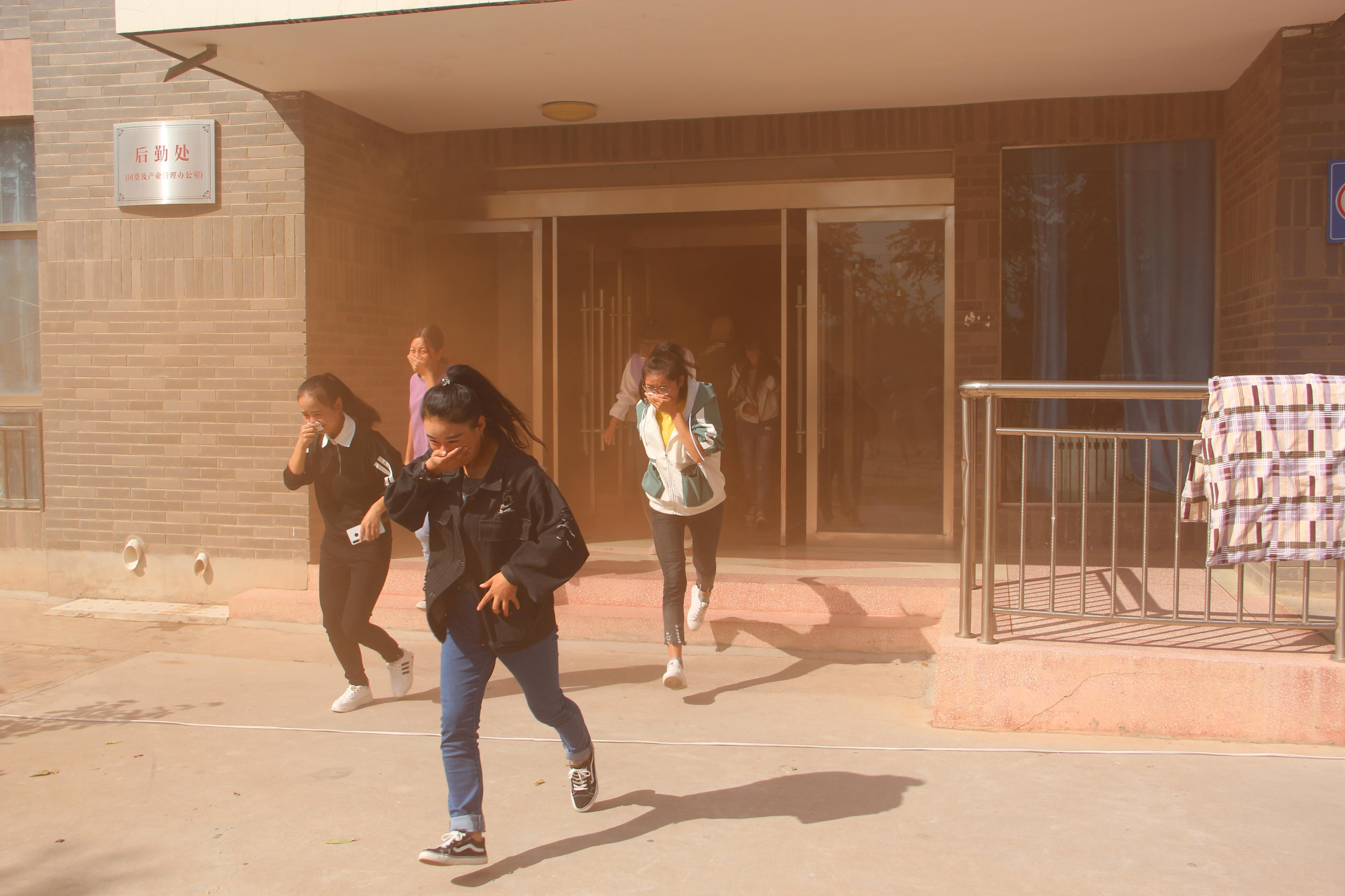 15時(shí)10分,疏散演練正式開(kāi)始。隨著火災(zāi)警報(bào)響起,學(xué)生公寓樓冒出滾滾濃煙,公寓管理人員迅速打開(kāi)所有應(yīng)急疏散通道,組織學(xué)生有序疏散。在安保人員的協(xié)助下,同學(xué)們用濕毛巾捂住口鼻,快速、有序從疏散通道撤離到了安全地帶。