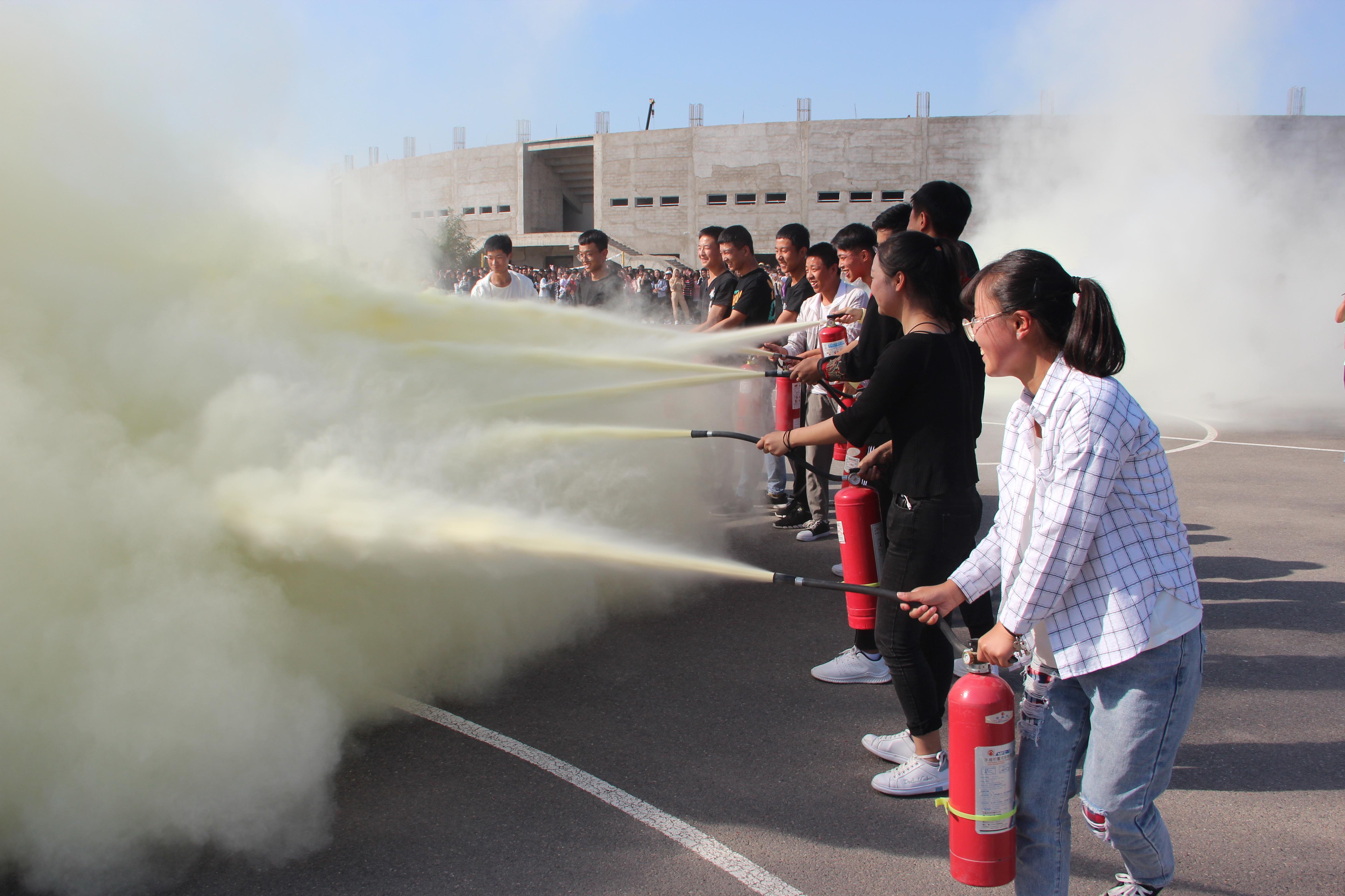 隨后,2019級(jí)新生整隊(duì)到操場(chǎng)參加了滅火演練。在消防隊(duì)員的講解和示范下,同學(xué)們現(xiàn)場(chǎng)學(xué)習(xí)了應(yīng)急逃生和消防安全常識(shí),部分師生代表、食堂工作人員親身體驗(yàn)了處置滅火器著火液化氣瓶、干粉滅火、通過(guò)模擬煙室逃生等操作。