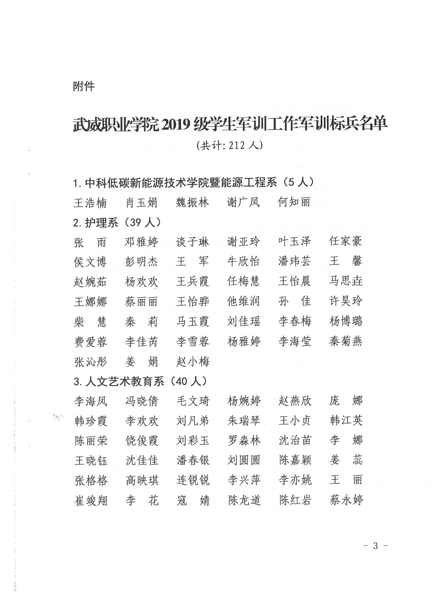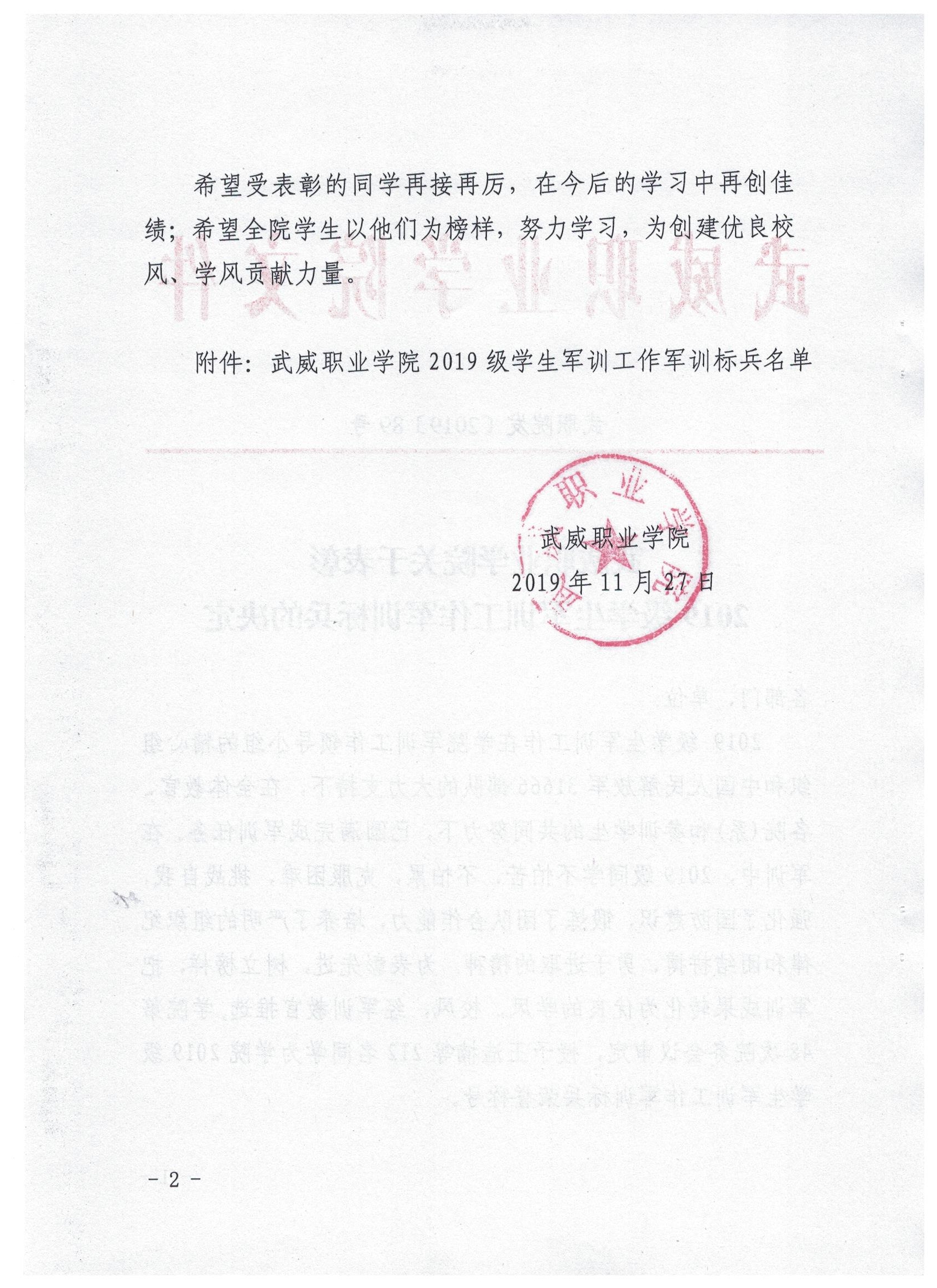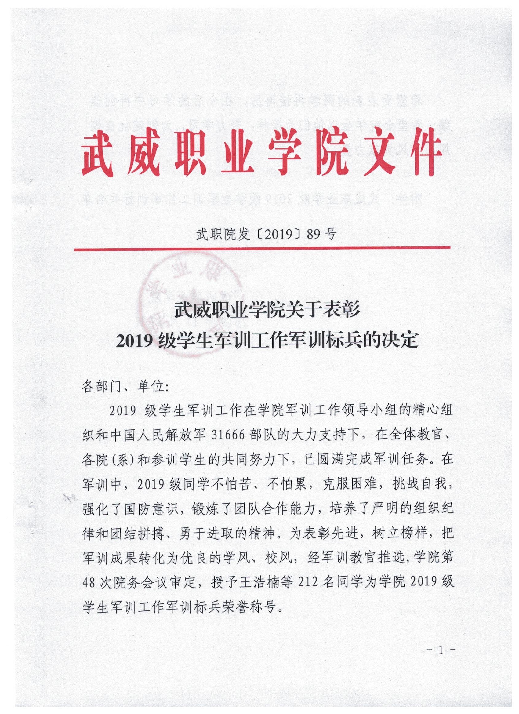 武威職業(yè)學院關(guān)于表彰2019級學生軍訓工作軍訓標兵的決定