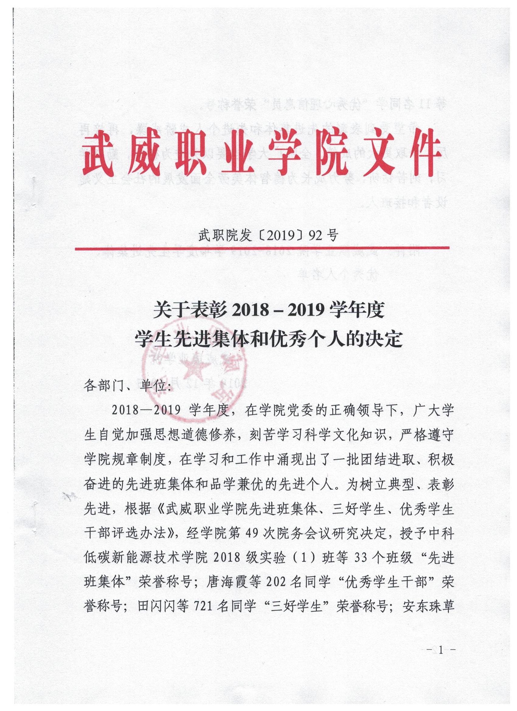 關(guān)于表彰2018-2019學年度學生工作先進個人的決定