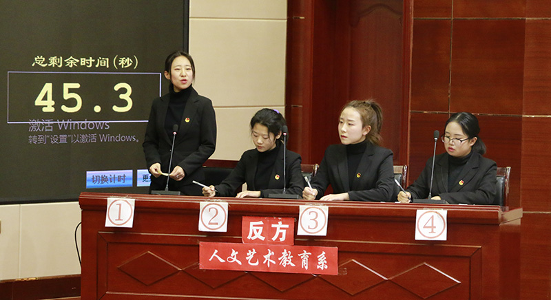 為慶祝中華人民共和國成立70周年,深入推進“不忘初心、牢記使命”主題教育活動扎實開展,進一步豐富校園文化生活,拓展大學生思辨能力,培養(yǎng)同學們的團隊合作精神,提高學生綜合素質,展現(xiàn)青年學生昂揚向上的青春風采和精神風貌,院團委舉辦了學院第十一屆大專辯論賽。12月24日晚,辯論賽決賽在大學生活動中心菁英廳舉行,200多名師生觀看了比賽。