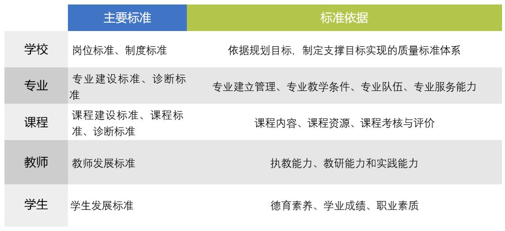 標準制定要體現(xiàn)多元質(zhì)量觀,采用剛性與柔性相結合的辦法,解決特色發(fā)展與創(chuàng)新發(fā)展的問題,堅持“目標導向與問題導向”的統(tǒng)一。從實際出發(fā),查找問題、研究問題、解決問題,重點解決學校內(nèi)部治理中存在的“透明管理”等突出問題;從專業(yè)建立管理、專業(yè)教學條件、專業(yè)隊伍、專業(yè)服務能力等維度制定專業(yè)建設標準和診斷標準;從課程內(nèi)容、課程資源、課程考核與評價等維度制定課程建設標準、課程標準和課程診斷標準;教師發(fā)展標準要以提升教師的執(zhí)教能力、教研能力和實踐能力為要素;學生發(fā)展標準要重點考慮學生的德育素養(yǎng)、學業(yè)成績、職業(yè)素質(zhì)。通過標準體系的打造,形成學校內(nèi)部質(zhì)量保證體系的標準鏈。