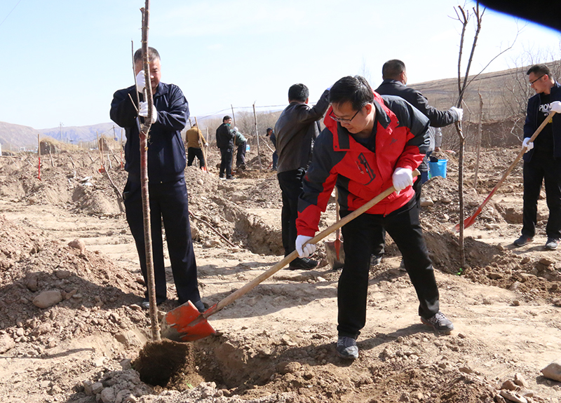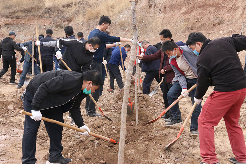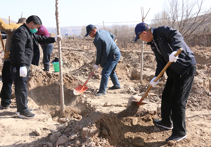 春風(fēng)吹拂處,新綠綻枝頭。為深入學(xué)習(xí)貫徹習(xí)近平總書記視察甘肅的重要講話和批示精神,認(rèn)真踐行綠水青山就是金山銀山的發(fā)展理念,實(shí)施綠色發(fā)展戰(zhàn)略,進(jìn)一步加強(qiáng)祁連山生態(tài)環(huán)境保護(hù)與治理,幫助幫扶鎮(zhèn)打贏脫貧攻堅(jiān)戰(zhàn),實(shí)施鄉(xiāng)村振興戰(zhàn)略,4月9日,學(xué)院領(lǐng)導(dǎo)班子成員、幫扶干部、駐村干部及部分教職工70多人深入結(jié)對幫扶鎮(zhèn)——黑松驛鎮(zhèn)開展義務(wù)植樹活動,建設(shè)“生態(tài)示范林”。春光沐浴的祁連山腳下黑松驛鎮(zhèn),春意盎然,生機(jī)勃勃,正是植樹好時(shí)節(jié)。廣大教職工一下車就拿起鐵鍬到植樹現(xiàn)場,與黑松驛鎮(zhèn)政府部分干部一起投入植樹活動,按照“橫看直線側(cè)一線、三埋兩踩一提苗”的技術(shù)要求,三人一組,分工協(xié)作,有序配合,揮鍬培土、扶苖踩土、圍堰澆水,現(xiàn)場一派熱火朝天的勞動景象。當(dāng)天植樹育林約20余畝,一棵棵新栽的樹苗整齊排列,迎風(fēng)挺立。通過義務(wù)植樹,廣大教職工用實(shí)際行動傳播著生態(tài)文明、綠色發(fā)展理念,切實(shí)幫助幫扶鎮(zhèn)綠起來,美起來,富起來。