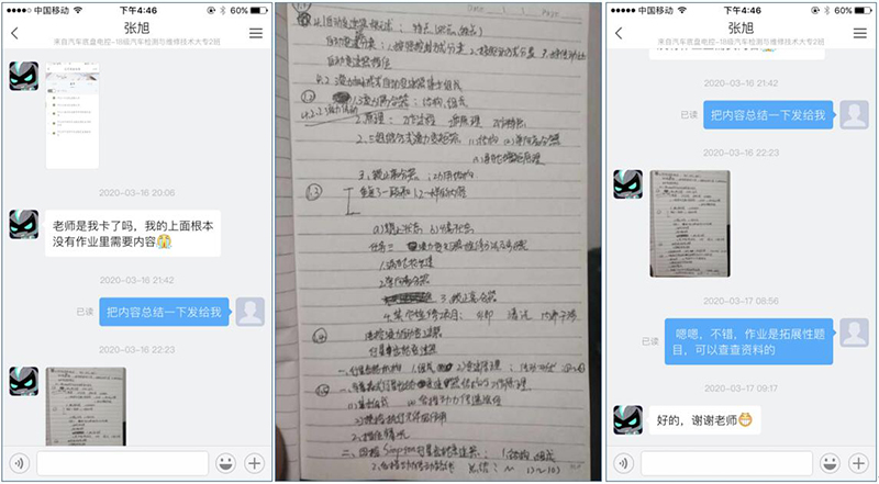 現(xiàn)代農(nóng)業(yè)技術(shù)系和汽車工程系的幾位學(xué)生春節(jié)前外出打工時,因疫情爆發(fā)未能及時返回,被滯留當(dāng)?shù)?。疫情緩和后企業(yè)復(fù)工,學(xué)生為了能按時參加在線學(xué)習(xí),努力克服了時間不足、上網(wǎng)不便、網(wǎng)絡(luò)卡頓等諸多問題,白天工作、晚上學(xué)習(xí),刻苦的身影令人動容。