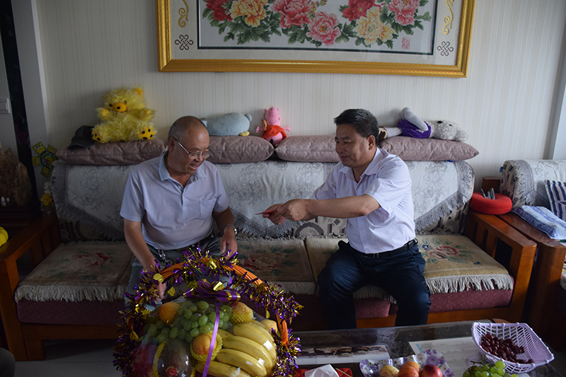 在老黨員鄭希禹家中,黨委書記、院長趙明關(guān)切地詢問了他的日常生活、身體狀況、子女工作等情況。感謝他為黨的事業(yè)和學(xué)院的發(fā)展做出的貢獻(xiàn),并叮囑他要照顧好自己的生活,祝愿他身體健康、生活愉快、家庭幸福。