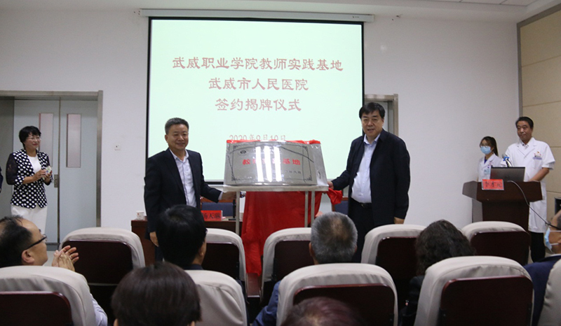 2020年9月10日上午,武威職業(yè)學(xué)院與武威市人民醫(yī)院在武威市人民醫(yī)院舉行教師實(shí)踐基地簽約暨揭牌儀式。學(xué)院黨委書記、院長(zhǎng)趙明、副院長(zhǎng)王永緒,武威市人民醫(yī)院黨委書記楊天琳、副書記、院長(zhǎng)王世中出席。學(xué)院部分職能科室負(fù)責(zé)人、醫(yī)學(xué)類專業(yè)教師代表及武威市人民醫(yī)院行政科室代表參加了儀式。武威市人民醫(yī)院黨委委員、副院長(zhǎng)李才元主持儀式。