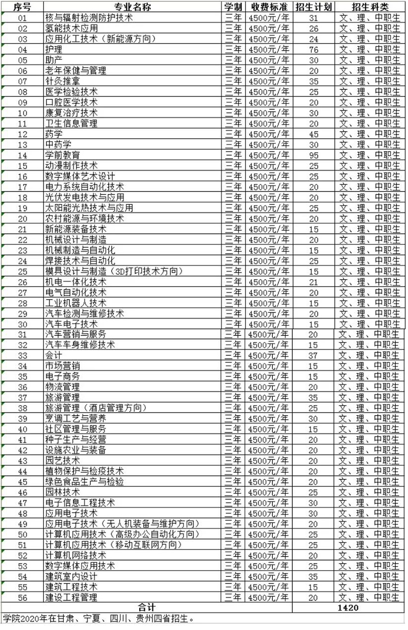 武威職業(yè)學(xué)院2020年普通高考及中職升學(xué)招生計(jì)劃