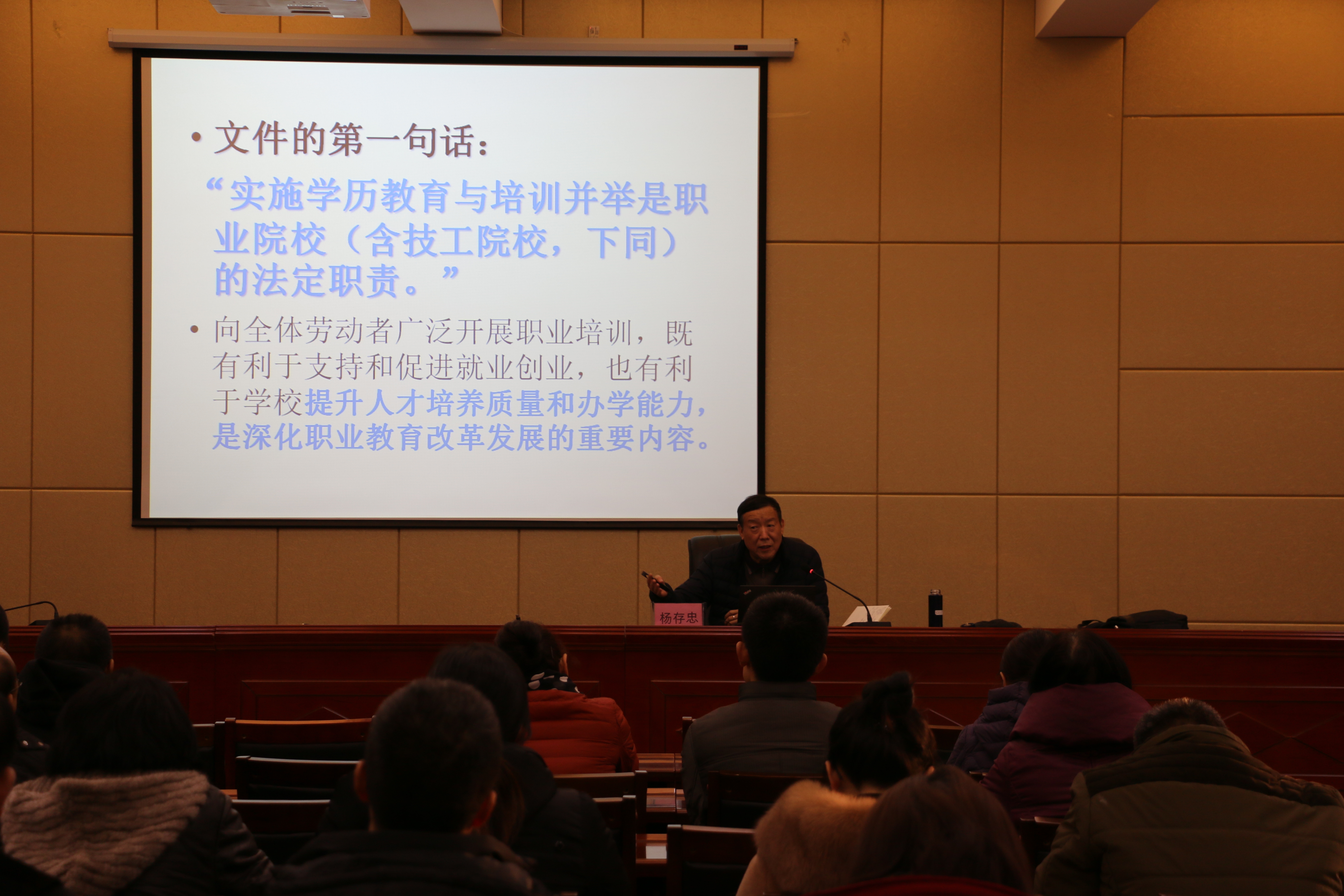 針對教育部11月25日發(fā)布的“關(guān)于做好《職業(yè)院校全面開展職業(yè)培訓(xùn) 促進(jìn)就業(yè)創(chuàng)業(yè)行動計劃》實施工作有關(guān)事項的通知”的文件(以下簡稱《行動計劃》),楊教授從《行動計劃》出臺的背景和意義、職業(yè)院校的法定職責(zé)、職業(yè)院校普遍存在的問題、《行動計劃》對職業(yè)院校提出的重點(diǎn)任務(wù)和行動措施以及如何推進(jìn)貫徹落實《行動計劃》等五個方面和大家進(jìn)行了學(xué)習(xí)分享。楊教授強(qiáng)調(diào),深化職業(yè)教育改革發(fā)展,職業(yè)院校敞開校門,廣泛開展培訓(xùn)工作,服務(wù)社會發(fā)展,是職業(yè)院校的法定責(zé)任,也是學(xué)院可持續(xù)發(fā)展和生存的必然趨勢?!缎袆佑媱潯穼β殬I(yè)院校提出了十個方面的行動措施一是廣泛開展企業(yè)職工技能培訓(xùn)。二是積極開展面向重點(diǎn)人群的就業(yè)創(chuàng)業(yè)培訓(xùn)。三是大力開展失業(yè)人員再就業(yè)培訓(xùn)。四是做好職業(yè)指導(dǎo)和就業(yè)服務(wù)。五是推進(jìn)培訓(xùn)資源建設(shè)和模式改革。六是加強(qiáng)培訓(xùn)師資隊伍建設(shè)。七是支持多方合作共建培訓(xùn)實訓(xùn)基地。八是完善職業(yè)院校開展培訓(xùn)的激勵政策。九是健全參訓(xùn)人員的支持鼓勵政策。十是建立培訓(xùn)評價與考核機(jī)制。楊教授希望大家能夠?qū)W好文件并認(rèn)真思考學(xué)院的改革發(fā)展。把立德樹人、服務(wù)發(fā)展、促進(jìn)就業(yè)、適應(yīng)需求的辦學(xué)理念傳承下去。