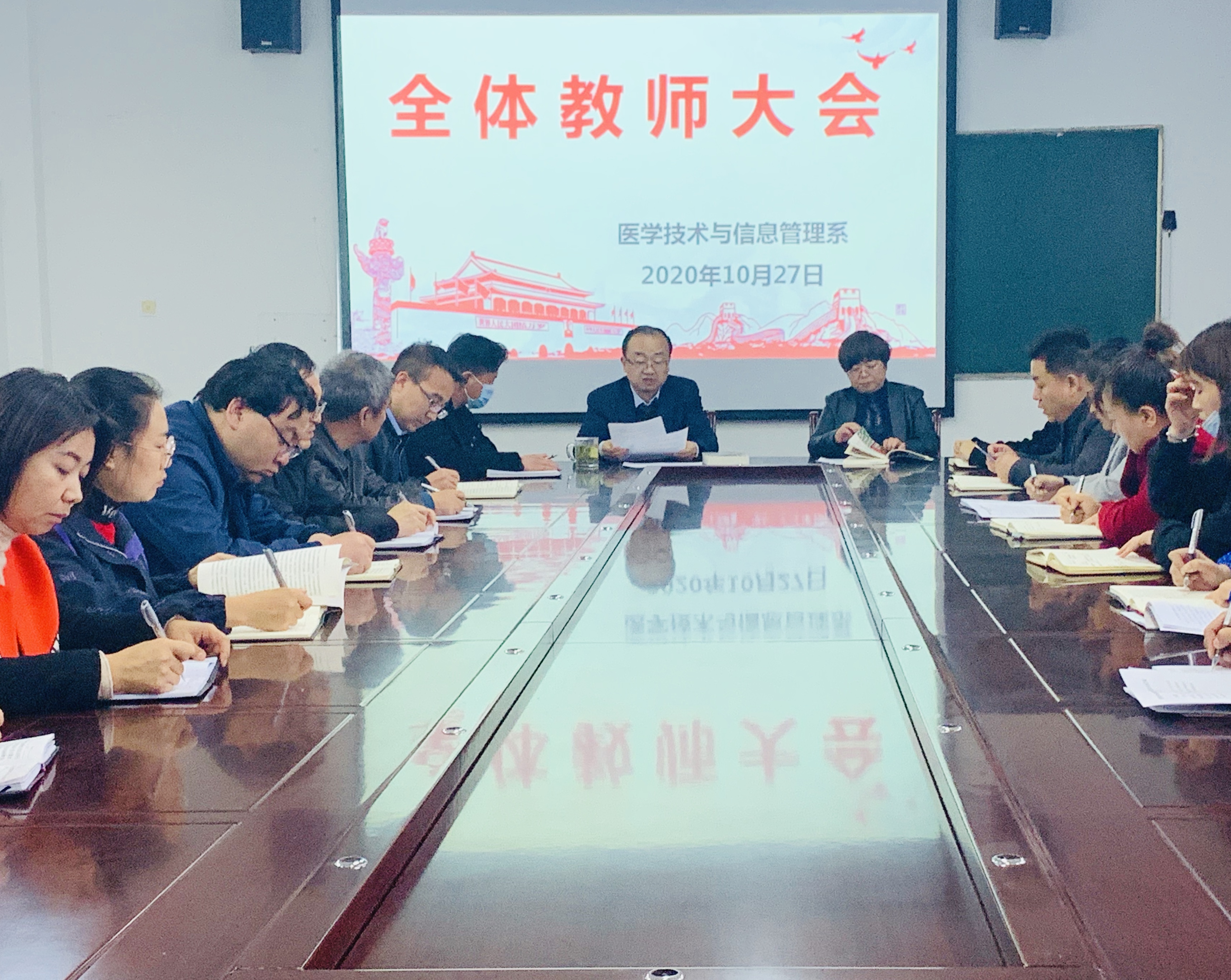 為認真學習貫徹《習近平談治國理政》(第三卷)、《習近平總書記教育重要論述講義》精神,鞏固深化“不忘初心、牢記使命”主題教育成果,提升我系教師的理論、業(yè)務水平,加強師德師風建設,培養(yǎng)高素質(zhì)教師隊伍,10月27日下午,醫(yī)學技術與信息管理系在尚德樓403會議室召開全系教師大會,會議由系黨總支書記黃文源主持,系主任楊如松及全系教師參加了會議。