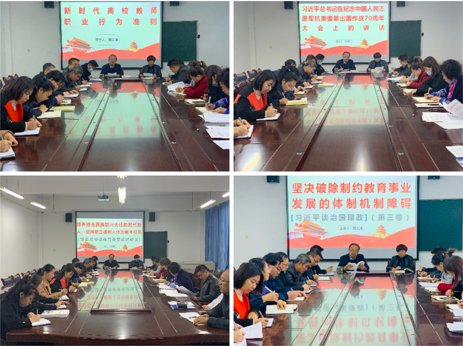 黃文源領學了《習近平談治國理政》(第三卷)第十二條 提高保障和改善民生水平——堅決破除制約教育事業(yè)發(fā)展的體質(zhì)機制障礙,解讀了《新時代高校教師職業(yè)行為十項準則》,要求所有教師要做以德立身、以德立學、以德施教、以德育德的楷模。楊如松領學了《習近平總書記教育重要論述講義》第二講 培養(yǎng)擔當民族復興大任的時代新人——堅持把立德樹人作為根本任務。楊建紅老師領學了習近平總書記在紀念中國 人民志愿軍抗美援朝出國作戰(zhàn)70周年大會的講話。