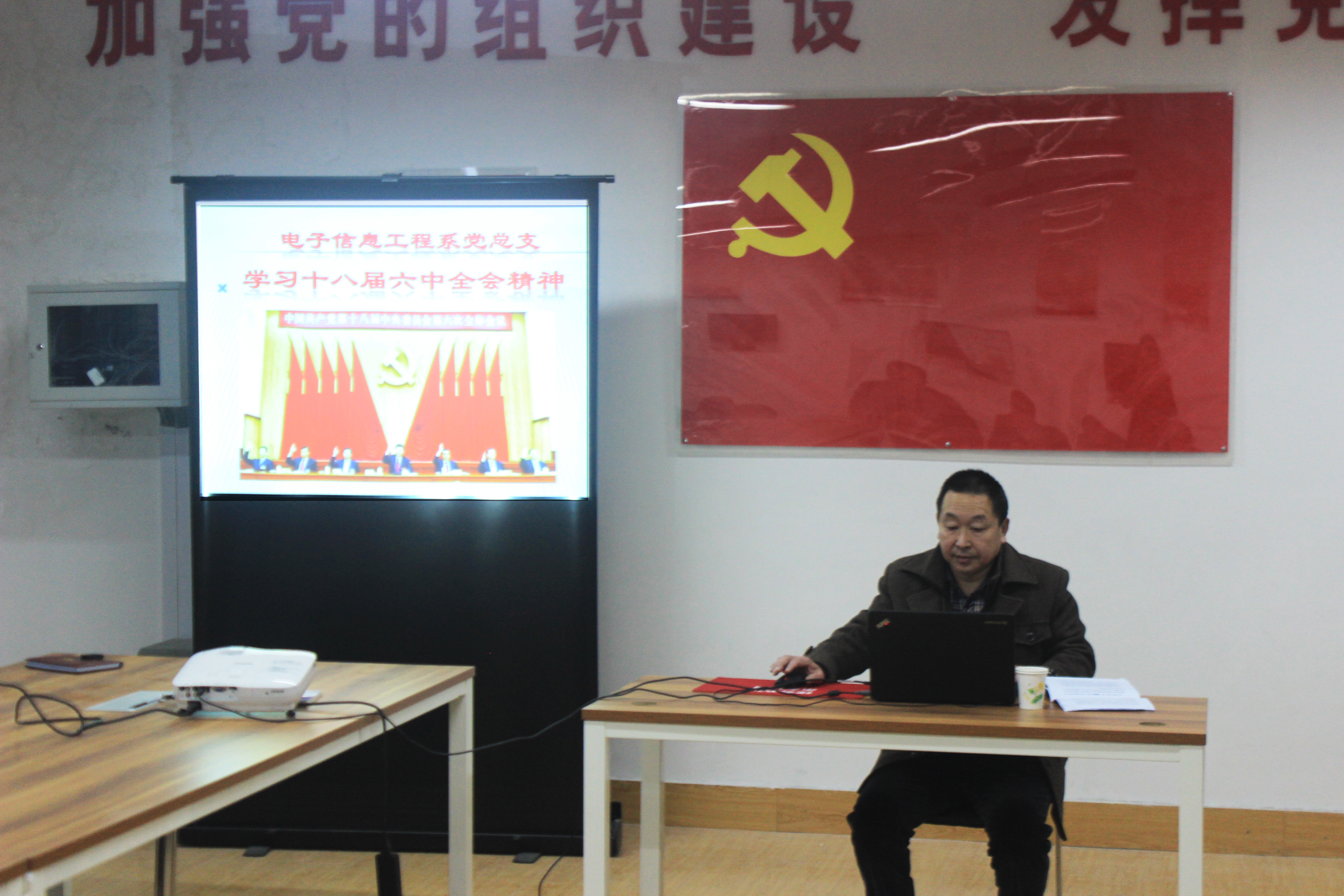 為認(rèn)真學(xué)習(xí)領(lǐng)會黨的十八屆六中全會重要精神,全面加強我系黨的建設(shè),更好地推動我系各項工作開展,按照學(xué)院《關(guān)于開展十八屆六中全會精神宣講的通知》要求,電子信息工程系于1月4日邀請人文藝術(shù)教育系劉心副教授進(jìn)行了十八屆六中全會精神宣講。會議由系黨總支書記袁青年同志主持,全體教師及學(xué)生入黨積極分子參加了宣講會。