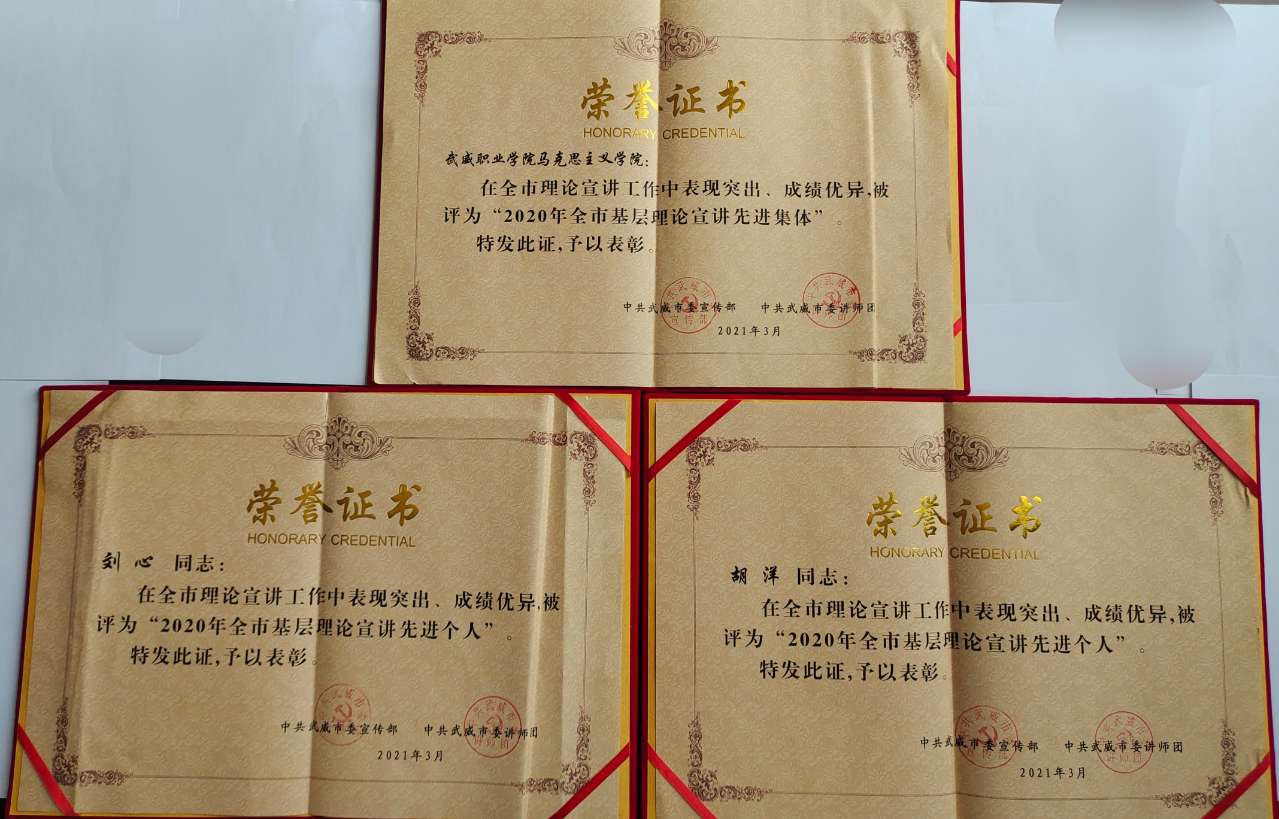 3月25日下午,武威市委宣傳部組織召開了“黨史教育專題宣講動員會暨2020年宣講工作先進集體和個人表彰會”。武威職業(yè)學院馬克思主義學院被授予“2020年全市基層理論宣講先進集體”榮譽稱號,同時馬克思主義學院教師、翟存祥名師工作室成員劉心、胡洋被授予“2020年全市基層理論宣講先進個人”榮譽稱號。