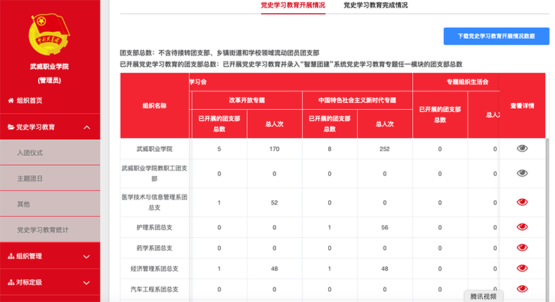 通過智慧團(tuán)建黨史學(xué)習(xí)教育專區(qū),可以更好的實(shí)現(xiàn)對團(tuán)組織、團(tuán)干部、團(tuán)員黨史學(xué)習(xí)教育情況的動態(tài)采集,構(gòu)建全團(tuán)大數(shù)據(jù)統(tǒng)計(jì),及時掌握各級團(tuán)組織和團(tuán)員學(xué)習(xí)教育整體進(jìn)度,有針對性地做好監(jiān)督,實(shí)現(xiàn)對團(tuán)員團(tuán)干部的網(wǎng)絡(luò)化黨史學(xué)習(xí)指導(dǎo)管理,實(shí)時掌握團(tuán)員需求,創(chuàng)新活動載體,切實(shí)推動我院共青團(tuán)黨史學(xué)習(xí)教育活動扎實(shí)開展。
