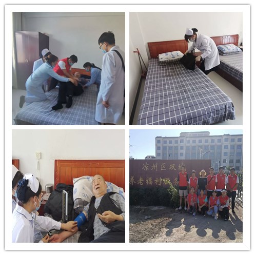 武威市涼州區(qū)雙城鎮(zhèn)敬老院目前共居住有102位老人,均為孤寡老人和五保戶,其中還有一部分殘疾老人。在敬老院里,志愿者們首先與院內(nèi)的八位照護員進行了交流,向他們學習了如何照護老人。隨后,在院長的引領下,指導老師與志愿者們探望了部分老人,并了解了老人們目前的生活和身體狀況。在老人的居室內(nèi),指導老師與身患殘疾的老人親切交談并為他們進行了心理疏導;志愿者們?yōu)槔先藗儨y量血壓、整理衣物、收拾屋子;在照護員的協(xié)助下,兩位志愿者為不能下床的老人進行了翻身、拍背等護理。老人們均表示活動很暖心,感謝志愿者們的愛心服務。
