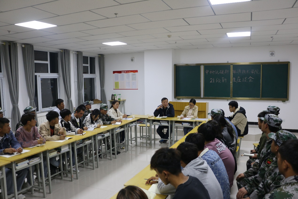 座談會上,楊存忠教授、米麗娟博士對新同學(xué)的到來表示熱烈歡迎,就同學(xué)們的軍訓(xùn)情況、學(xué)習生活情況進行了解。在互動交流環(huán)節(jié),對同學(xué)們存在的疑問,從所學(xué)專業(yè)與國家雙碳戰(zhàn)略聯(lián)系的角度就專業(yè)開設(shè)淵源、個人發(fā)展規(guī)劃、知識技能儲備、就業(yè)方向前景等方面進行答疑解惑、分析指導(dǎo)。