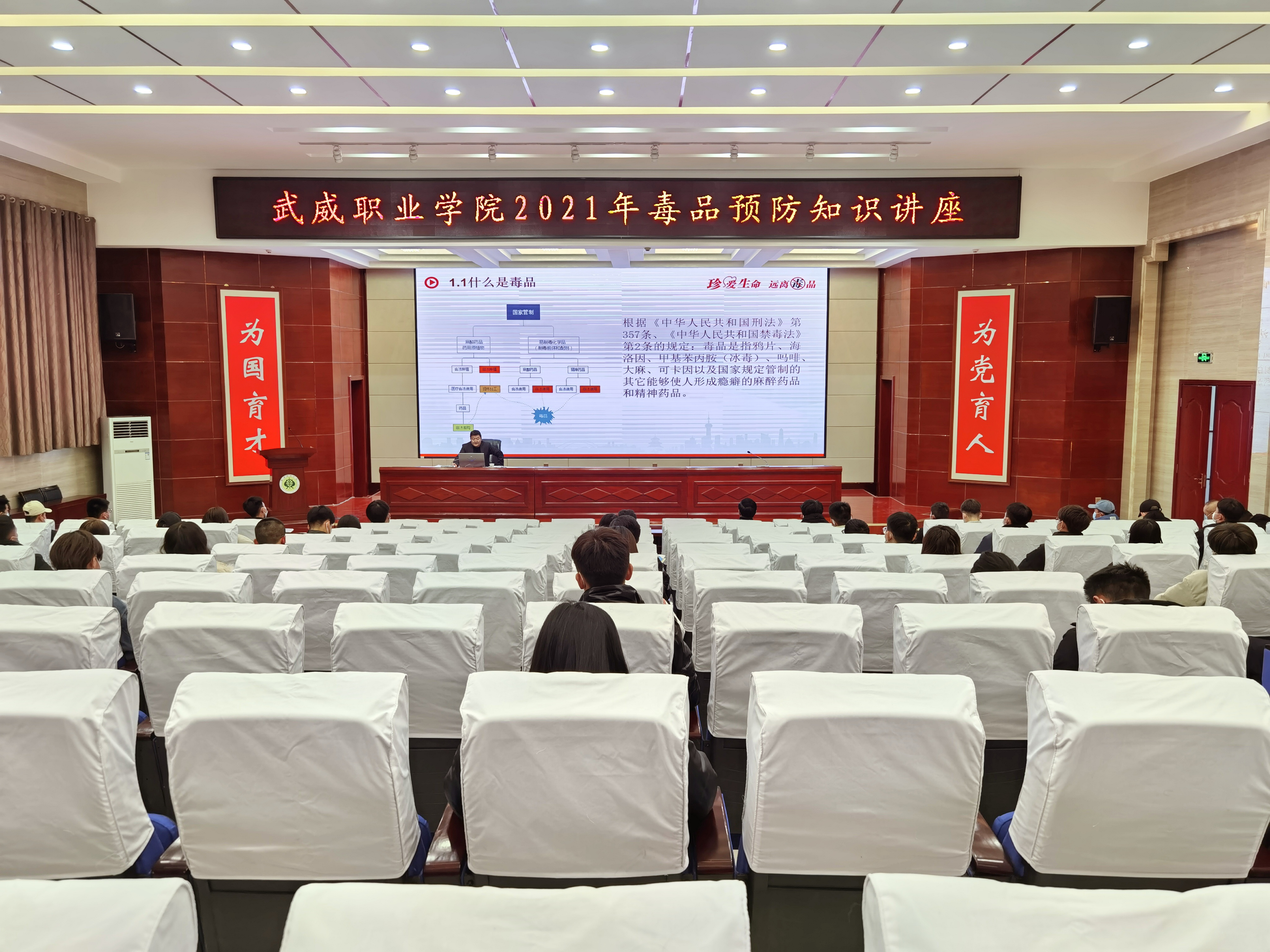 12月23日下午,學院邀請市禁毒委副主任、市政府副秘書長魯學才在菁英廳作了題為“健康人生,綠色無毒”毒品預防知識講座,學院副院長張開禮、武威市公安局禁毒支隊政委杜興林與師生一起聆聽了講座。