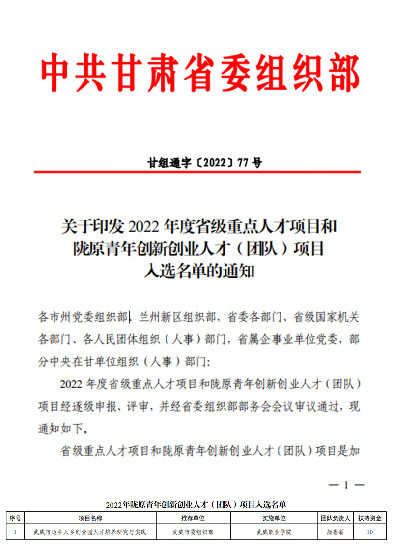 近日,省委組織部公布了2022年度省級重點人才項目和隴原青年創(chuàng)新創(chuàng)業(yè)人才(團隊)項目入選名單,我校顏魯薪老師主持的《武威市返鄉(xiāng)入鄉(xiāng)創(chuàng)業(yè)園人才培養(yǎng)研究與實踐》獲隴原青年創(chuàng)新創(chuàng)業(yè)人才(團隊)項目立項。