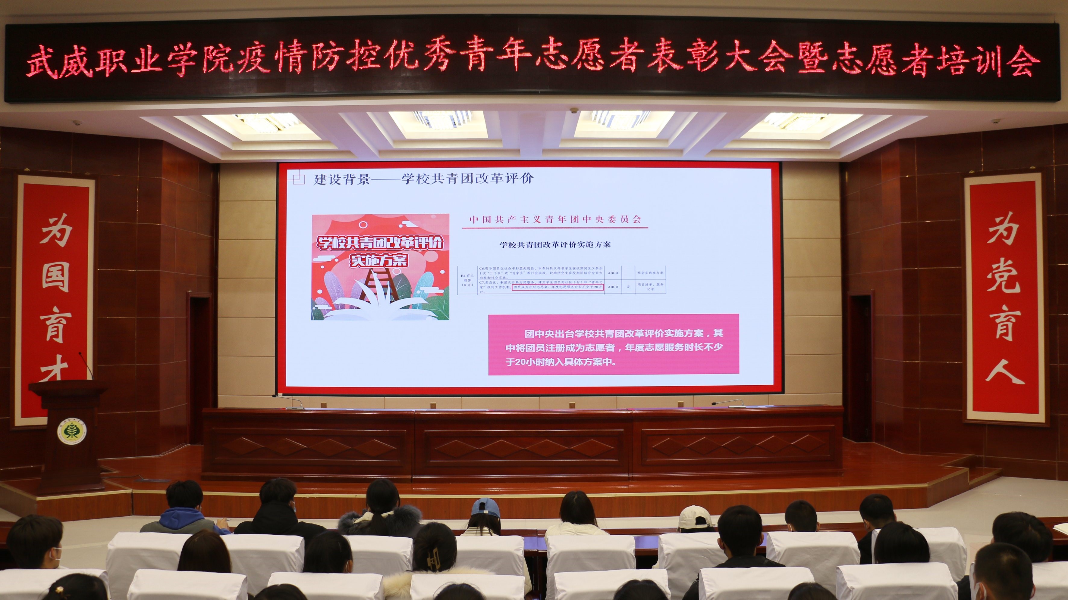 為表彰學(xué)院疫情防控期間涌現(xiàn)出的先進(jìn)典型,弘揚(yáng)偉大的抗疫精神,進(jìn)一步增強(qiáng)學(xué)院青年志愿者協(xié)會(huì)的組織凝聚力和團(tuán)隊(duì)協(xié)作力,院團(tuán)委于12月22日在學(xué)生發(fā)展中心菁英廳召開(kāi)疫情防控優(yōu)秀青年志愿者表彰大會(huì)暨志愿者培訓(xùn)會(huì),院團(tuán)委全體教師、志愿者代表參加了大會(huì)。