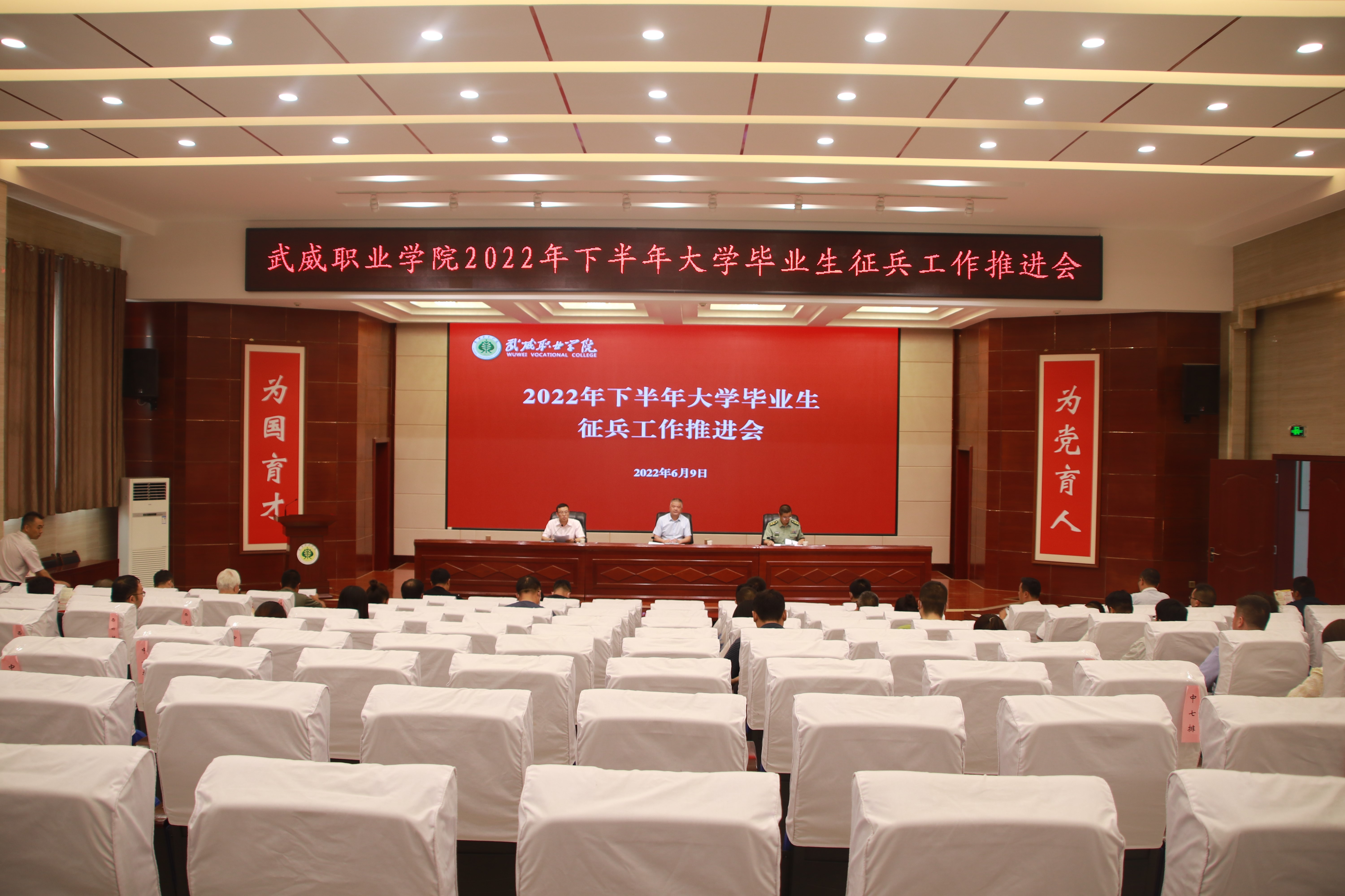 6月9日下午,學(xué)校2022年下半年大學(xué)畢業(yè)生征兵工作推進(jìn)會在菁英廳召開,學(xué)校黨委委員、副校長王守云,涼州區(qū)人武部中校副部長何志強(qiáng)出席會議。