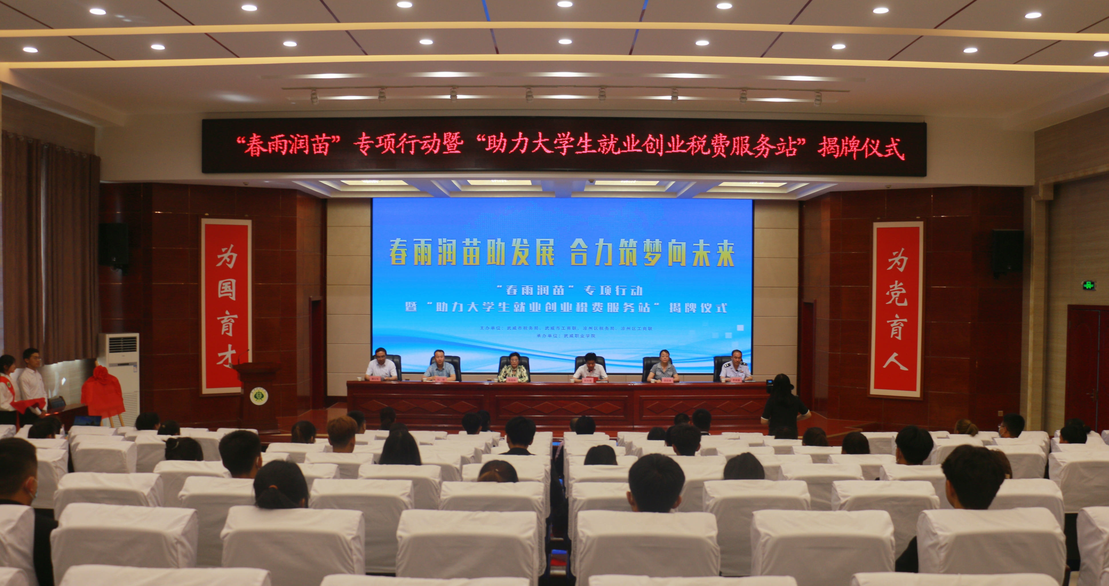6月10日下午,武威市稅務(wù)局聯(lián)合工商聯(lián)在學(xué)校菁英廳舉辦“春雨潤(rùn)苗”專(zhuān)項(xiàng)行動(dòng)暨“助力大學(xué)生就業(yè)創(chuàng)業(yè)稅費(fèi)服務(wù)站”揭牌儀式。武威市稅務(wù)局黨委委員、副局長(zhǎng)劉永德,武威市工商聯(lián)副主席張連科,涼州區(qū)工商聯(lián)副主席唐紅生,學(xué)校黨委委員、副校長(zhǎng)田迎春出席揭牌儀式,涼州區(qū)稅務(wù)局黨委委員、副局長(zhǎng)李斌盛主持活動(dòng)。武威市稅務(wù)局黨委委員、副局長(zhǎng)劉永德在講話中指出“助力大學(xué)生就業(yè)創(chuàng)業(yè)稅費(fèi)服務(wù)站”的成立,既是武威稅務(wù)部門(mén)優(yōu)化稅費(fèi)服務(wù)的有力舉措,也是學(xué)院、工商聯(lián)和稅務(wù)的一次深入合作,更是三方匯聚合力,助力穩(wěn)就業(yè)、保民生、促發(fā)展的積極作為?!?/p>