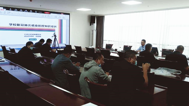 演練結(jié)束后,甘肅省武威腫瘤醫(yī)院感染管理科疫情防控專家在能源科技樓811會議室對學(xué)校疫情防控領(lǐng)導(dǎo)小組全體成員進行疫情防控知識培訓(xùn),全體輔導(dǎo)員、班主任,醫(yī)務(wù)室全體人員及其他相關(guān)人員通過在線視頻學(xué)習(xí),培訓(xùn)會議由學(xué)校副校長王永緒主持。