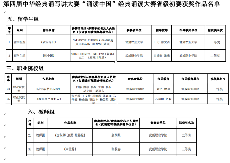 今日,甘肅省教育廳下發(fā)《甘肅省語(yǔ)言文字工作委員會(huì) 甘肅省教育廳關(guān)于公布第四屆中華經(jīng)典誦寫(xiě)講大賽“誦讀中國(guó)”經(jīng)典誦讀大賽及“筆墨中國(guó)”漢字書(shū)寫(xiě)大賽省級(jí)初賽獲獎(jiǎng)作品名單的通知》,學(xué)校選送的留學(xué)生組作品《讀中國(guó)》榮獲二等獎(jiǎng),并由省教育廳推送參加國(guó)賽誦讀大賽;