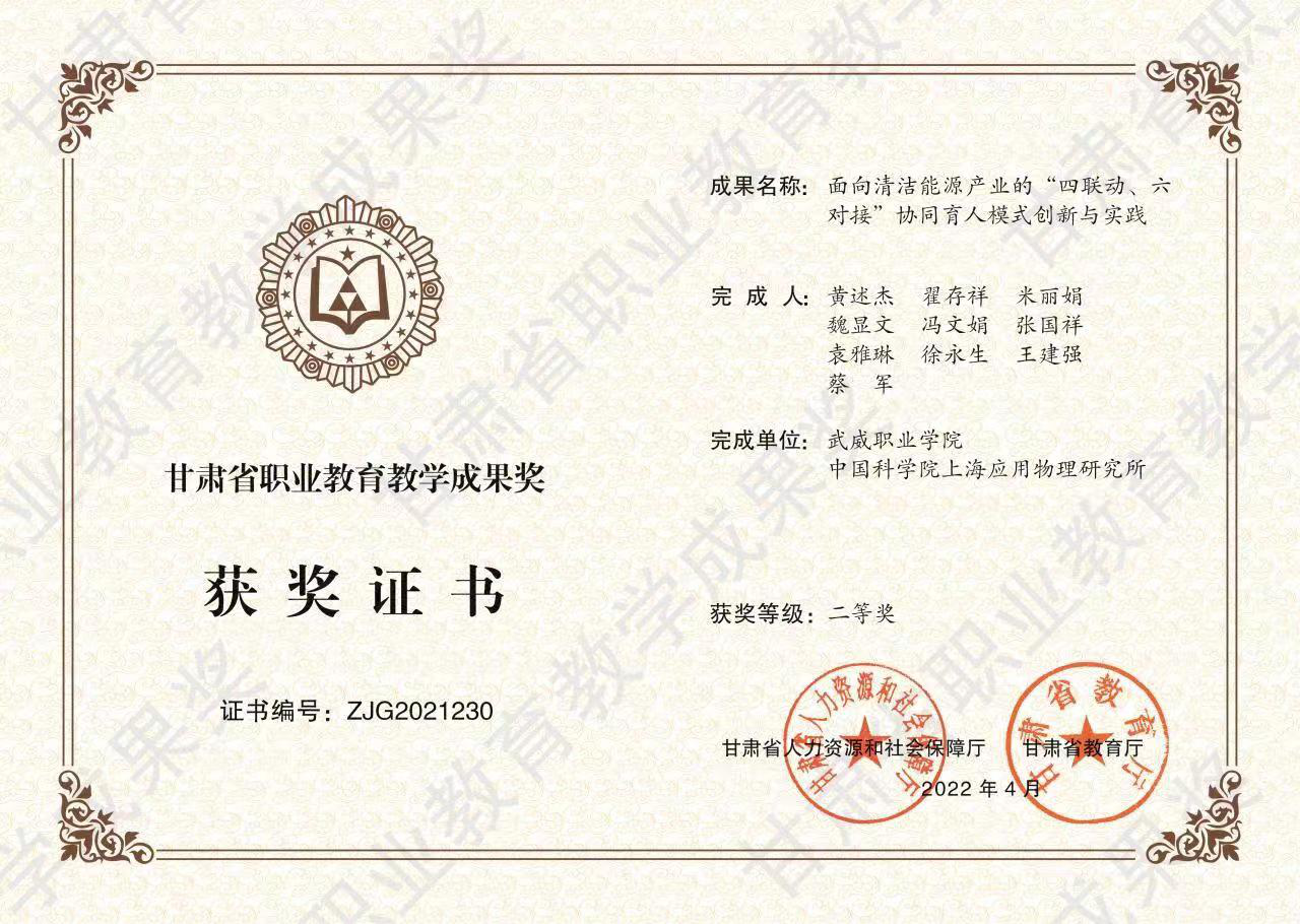 近日,甘肅省人力資源和社會保障廳、甘肅省教育廳下發(fā)《關(guān)于表彰2021年甘肅省職業(yè)教育教學(xué)成果獎的決定》。我校中科低碳新能源技術(shù)學(xué)院與中國科學(xué)院上海應(yīng)用物理研究所聯(lián)合完成的《面向清潔能源產(chǎn)業(yè)的“四聯(lián)動、六對接”協(xié)同育人模式創(chuàng)新與實(shí)踐》成果獲得二等獎。