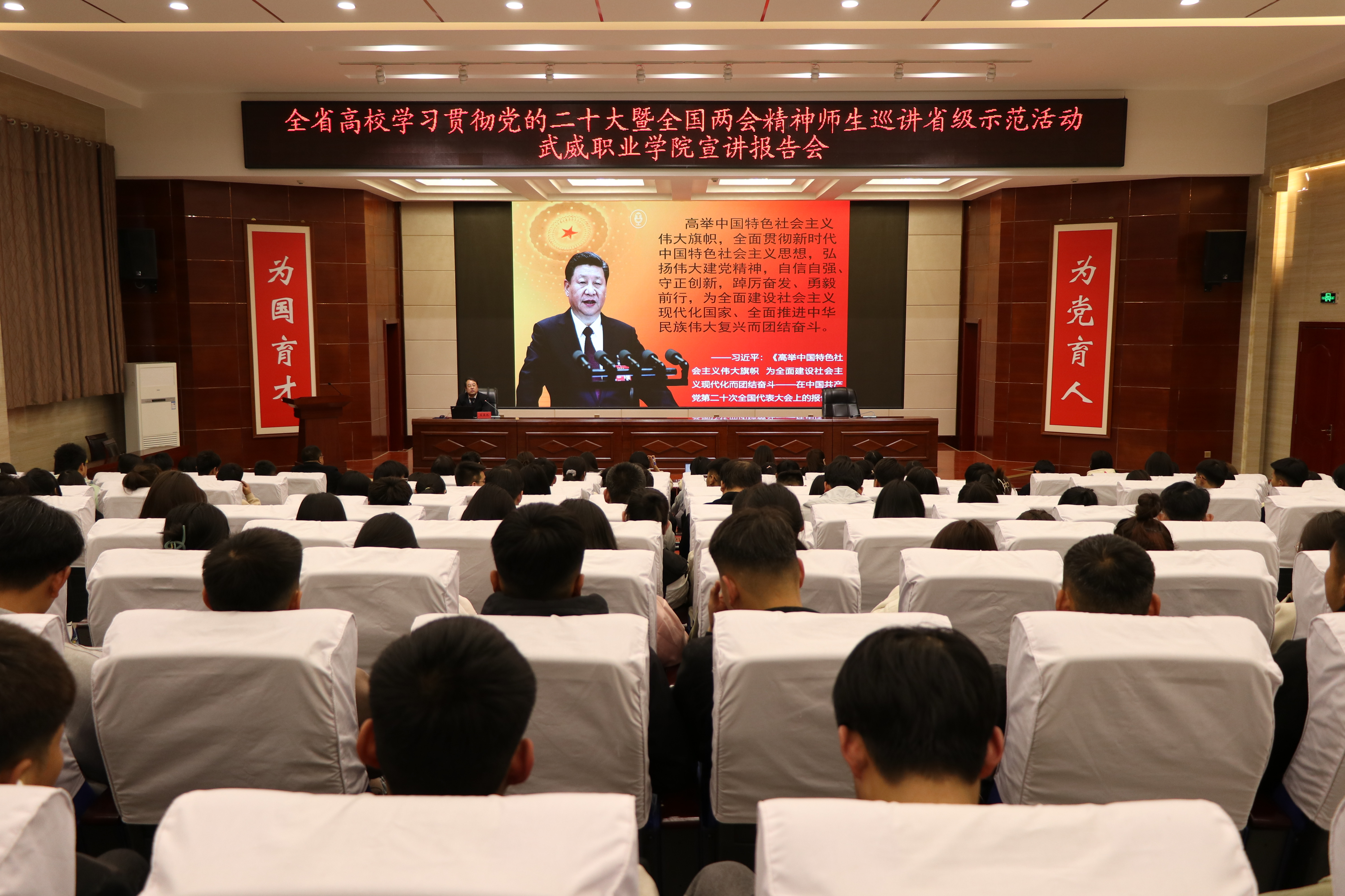 4月23日下午,省委教育工委“逐夢新征程 奮斗創(chuàng)未來”全省高校學習貫徹黨的二十大暨全國兩會精神師生巡講省級示范活動,第五巡講團來我校開展宣講。第五巡講團組長、蘭州交通大學馬克思主義學院蘇星鴻教授,作了專題報告。學校宣傳統(tǒng)戰(zhàn)部全體成員、馬克思主義學院全體教師、各二級學院學生代表共計200余人聆聽了巡講報告。