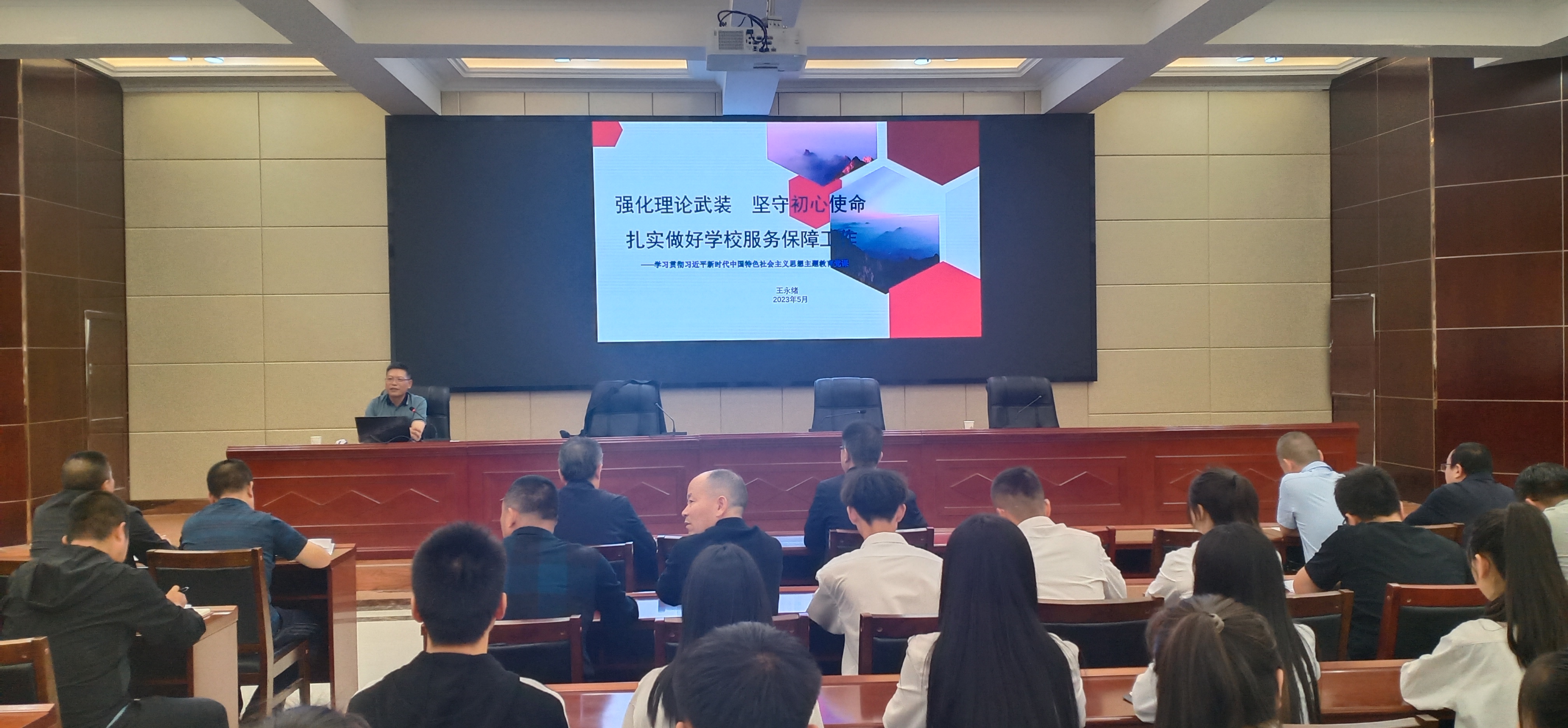 5月30日,學(xué)校黨委委員、副校長(zhǎng)王永緒以《強(qiáng)化理論武裝?堅(jiān)守初心使命——扎實(shí)做好學(xué)校服務(wù)保障工作》為題,在學(xué)校行樹(shù)樓北側(cè)學(xué)術(shù)報(bào)告廳講授學(xué)習(xí)貫徹習(xí)近平新時(shí)代中國(guó)特色社會(huì)主義思想主題教育專題黨課。信息技術(shù)學(xué)院全體師生黨員參加黨課學(xué)習(xí)。